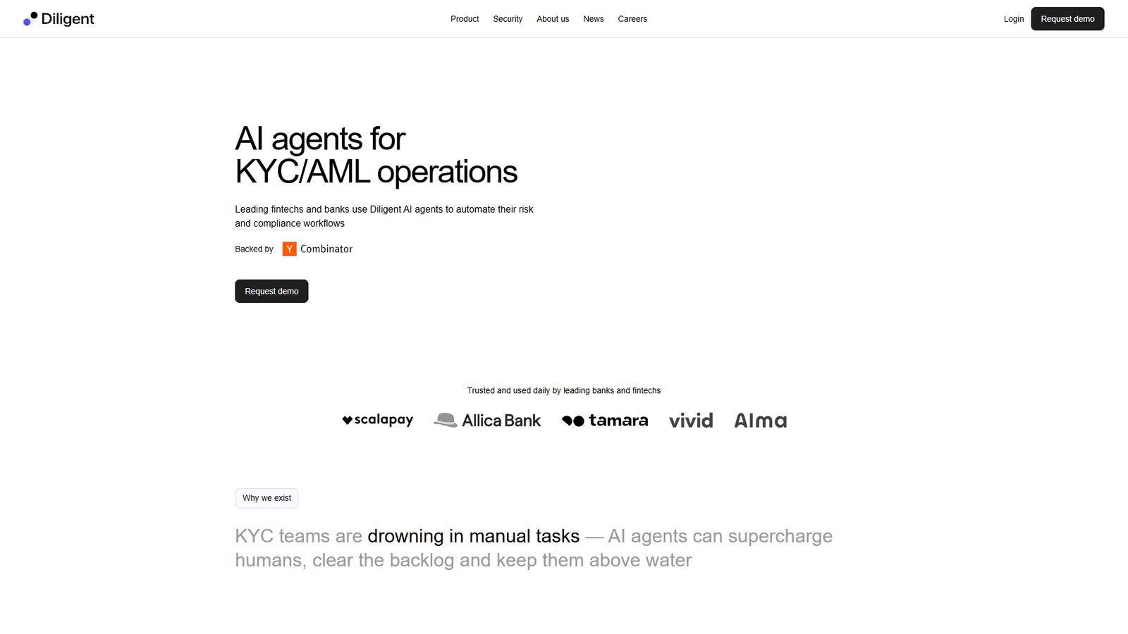 Diligent — это специализированные AI-агенты для автоматизации KYC/AML-процессов в банках и финтех-компаниях. Инструмент фокусируется на операциях по проверке клиентов, управлении рисками и соблюдении требований регуляторов.
