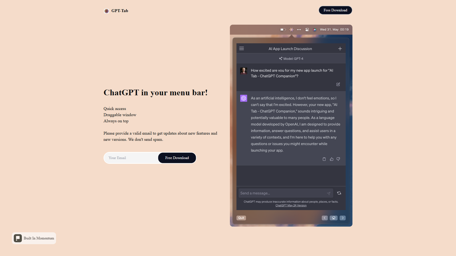 GPT-Tab — это удобный способ получить доступ к ChatGPT прямо из строки меню на вашем компьютере. Сервис превращает ИИ-ассистента в всегда доступный инструмент, который запускается в один клик, не отвлекая от текущей работы и не загромождая экран браузером.