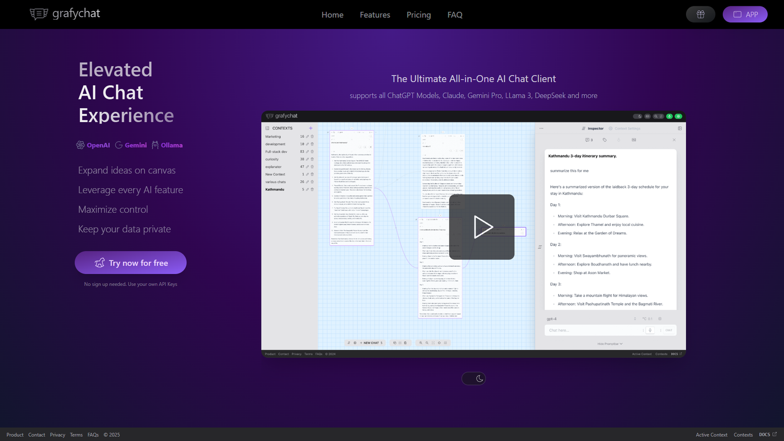 grafychat — десктопный и веб‑клиент для работы сразу с несколькими крупными языковыми моделями в одном интерфейсе. Поддерживаются ChatGPT, Claude, Gemini, Llama 3 (включая локальный через Ollama), DeepSeek и другие модели.