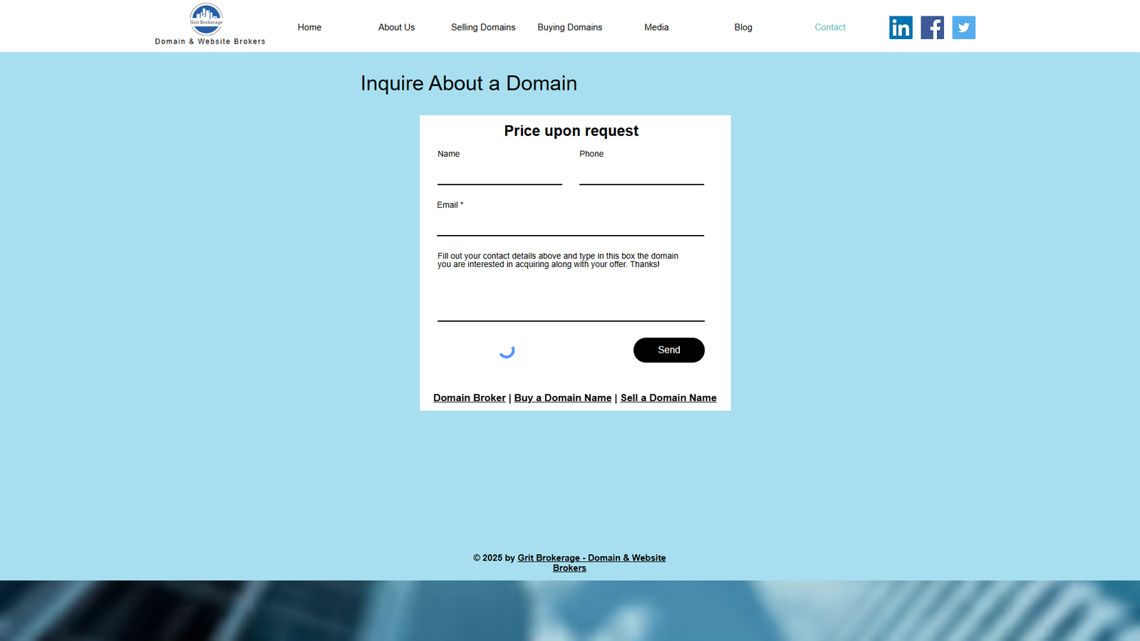 Grit Brokerage Domain Inquiry — это онлайн-форма для запроса стоимости и покупки доменных имён через доменного брокера. Сервис ориентирован на тех, кто хочет приобрести уже занятый домен или оценить его потенциальную стоимость перед сделкой.