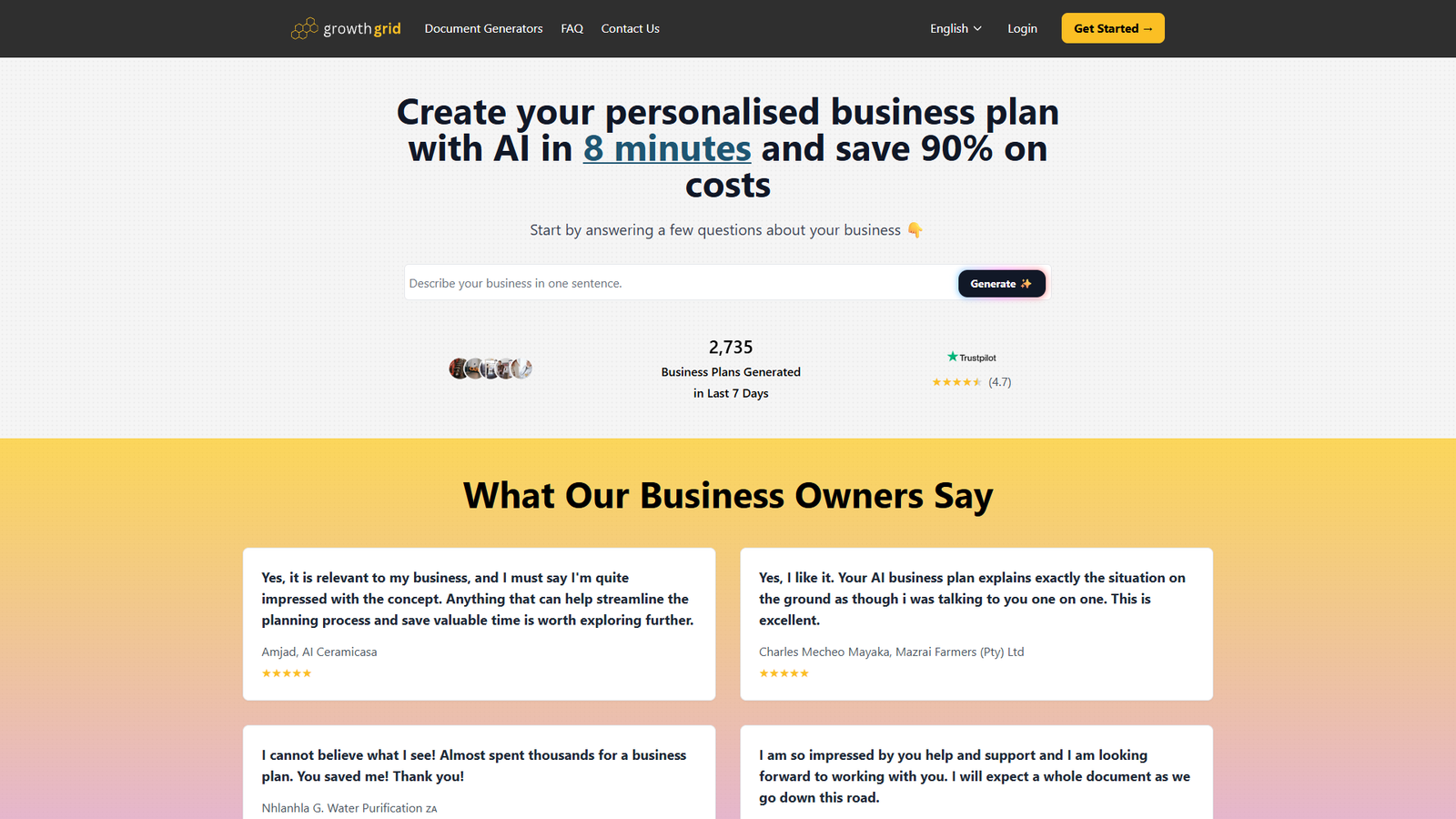 GrowthGrid помогает предпринимателям и основателям быстро собирать продуманный бизнес-план с опорой на ИИ. Вместо долгих шаблонов и таблиц пользователь отвечает на ключевые вопросы о продукте, рынке и модели дохода, а система превращает это в структурированный документ.