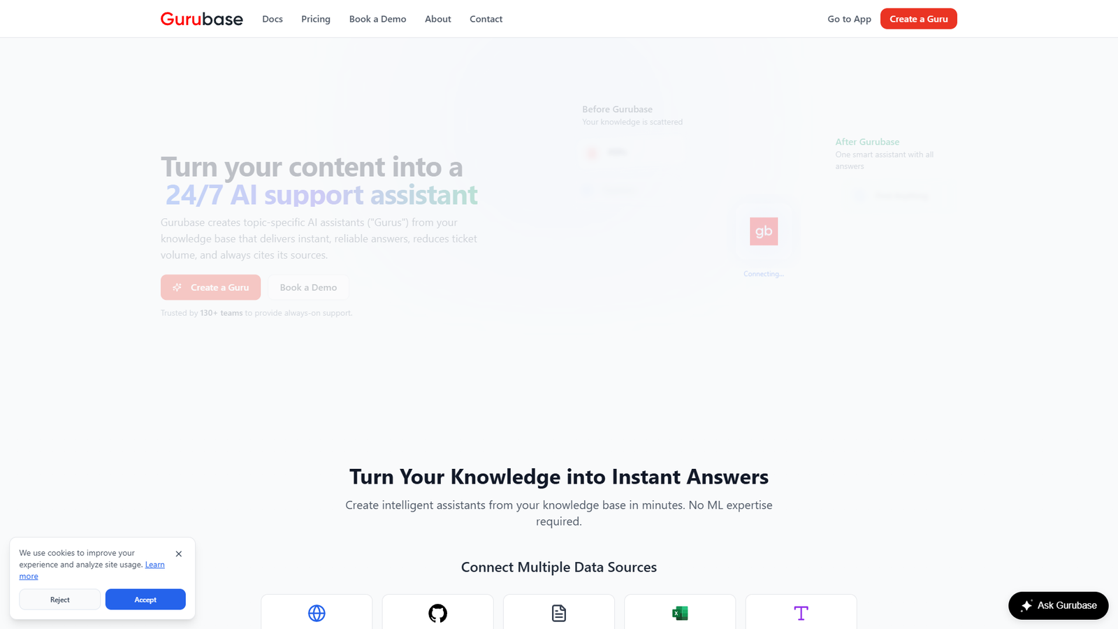 Gurubase — это платформа, которая превращает вашу существующую базу знаний в круглосуточного AI-ассистента поддержки. Сервис подключается к документации, сайтам, PDF, GitHub, Zendesk, Jira, Confluence, видео и другим источникам, объединяя разрозненные данные в один «умный» центр ответов.