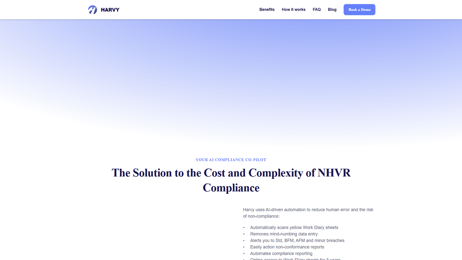 HARVY — это специализированный AI‑портал для автоматизации работы с водительскими рабочими дневниками и соблюдения требований NHVR в сфере тяжёлого автотранспорта. Сервис помогает транспортным компаниям избавиться от рутинного ввода данных и снизить риски штрафов за несоблюдение норм.