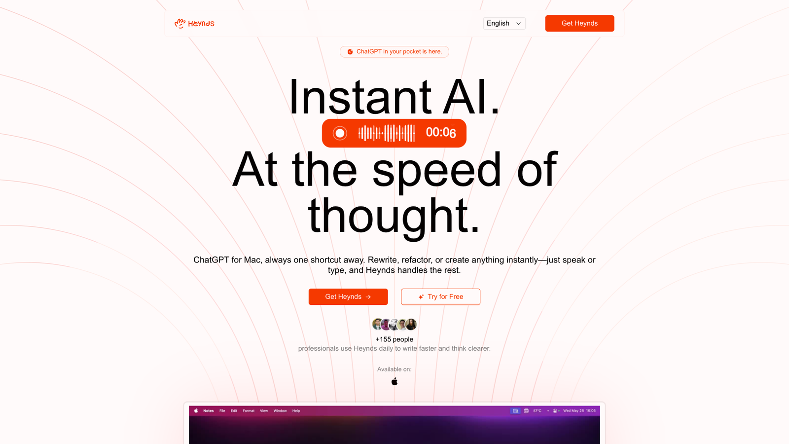 Heynds — это быстрый интерфейс к ChatGPT для macOS, который всегда под рукой. Приложение вызывается одной горячей клавишей и превращает любые черновые мысли в аккуратный текст: заметки, письма, сообщения или рабочие документы.