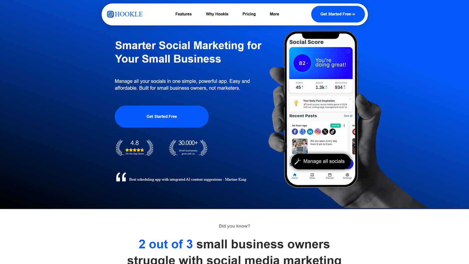 Hookle — AI‑ассистент и менеджер соцсетей для малого бизнеса. Сервис помогает быстрее придумывать контент, оформлять публикации и вести несколько аккаунтов в одном простом приложении — без «маркетинговой» сложности и дорогих агентств.