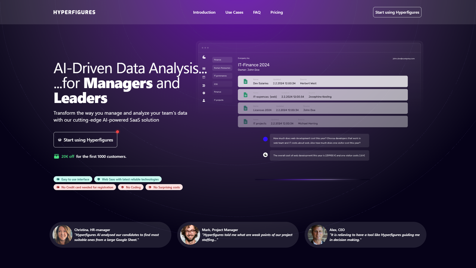 Hyperfigures — это веб‑решение для управленцев, которое использует ИИ для анализа рабочих данных команды. Сервис фокусируется на менеджерах и лидерах, которым нужно быстро понимать, что происходит в проектах и процессах, без сложных таблиц и ручных сводок.
