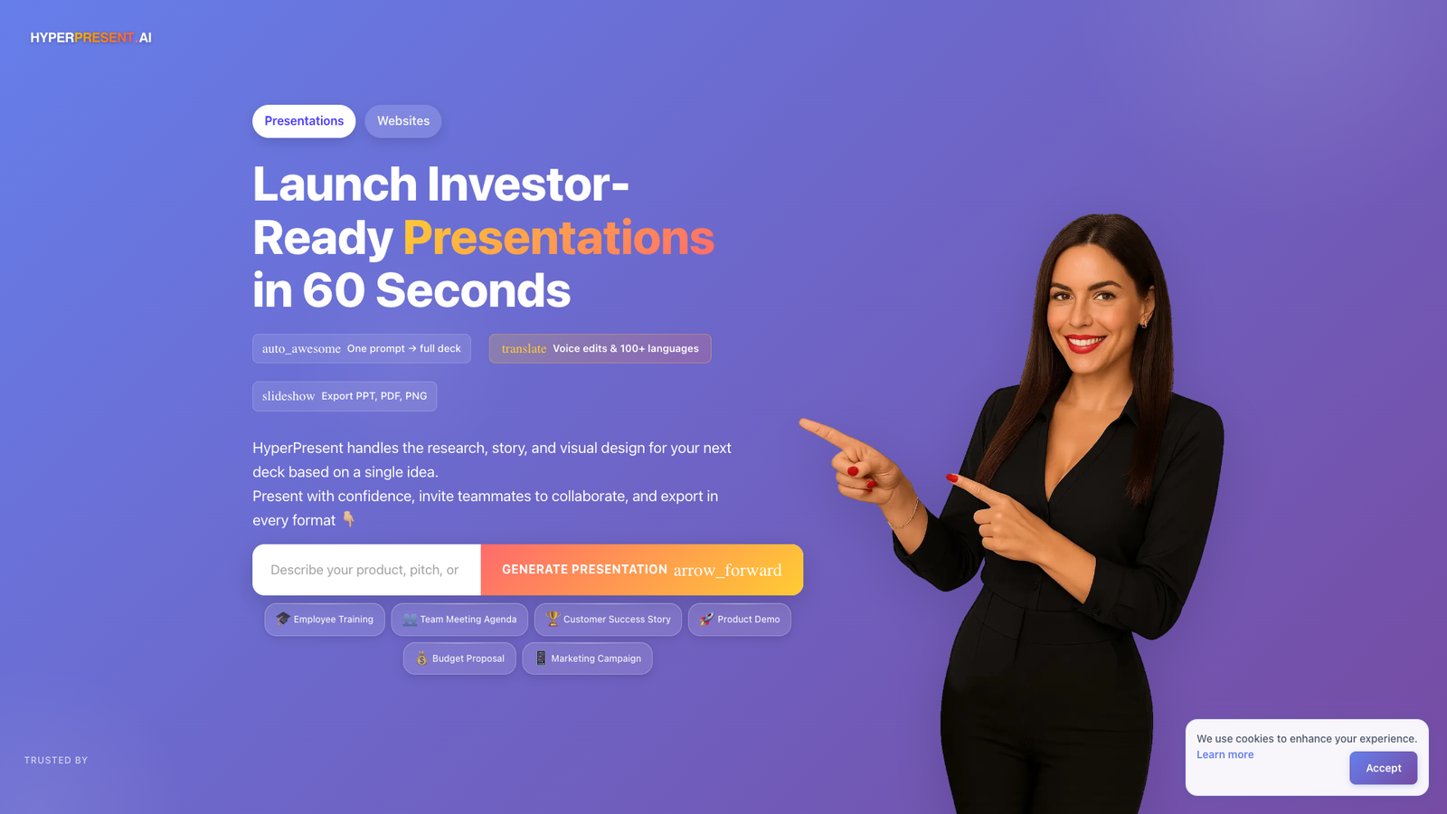 HyperPresent AI ускоряет подготовку деловых презентаций, лендингов и небольших сайтов. Пользователь задает цель — питч для инвесторов, продающий лендинг или маркетинговую страницу — а нейросеть подбирает структуру, тексты и визуальное оформление.