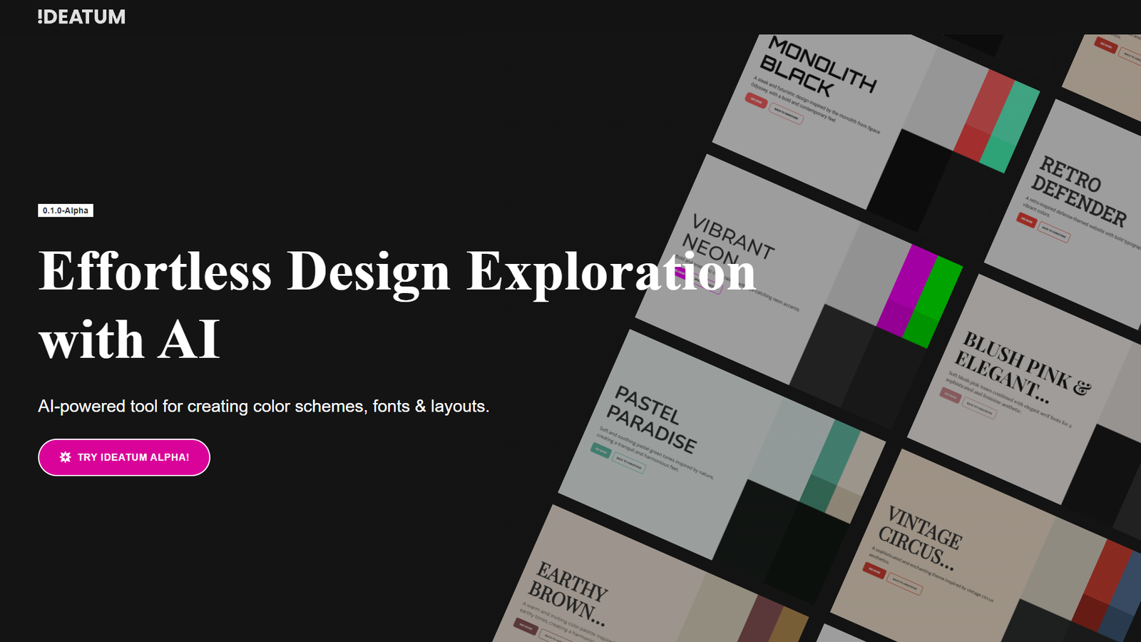 Ideatum AI помогает быстро подбирать цветовые схемы, шрифтовые пары и базовые макеты на основе одного текстового запроса. Пользователь описывает бренд, продукт или настроение, а нейросеть генерирует готовые концепции оформления.