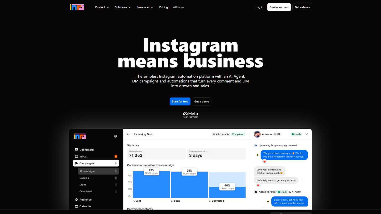 Inrō — это платформа автоматизации Instagram, которая превращает входящие и исходящие Direct-сообщения и комментарии в стабильный источник лидов, продаж и повторных касаний с аудиторией. Сервис помогает брендам, блогерам и e-commerce использовать DMs как полноценный канал маркетинга и клиентского сервиса.
