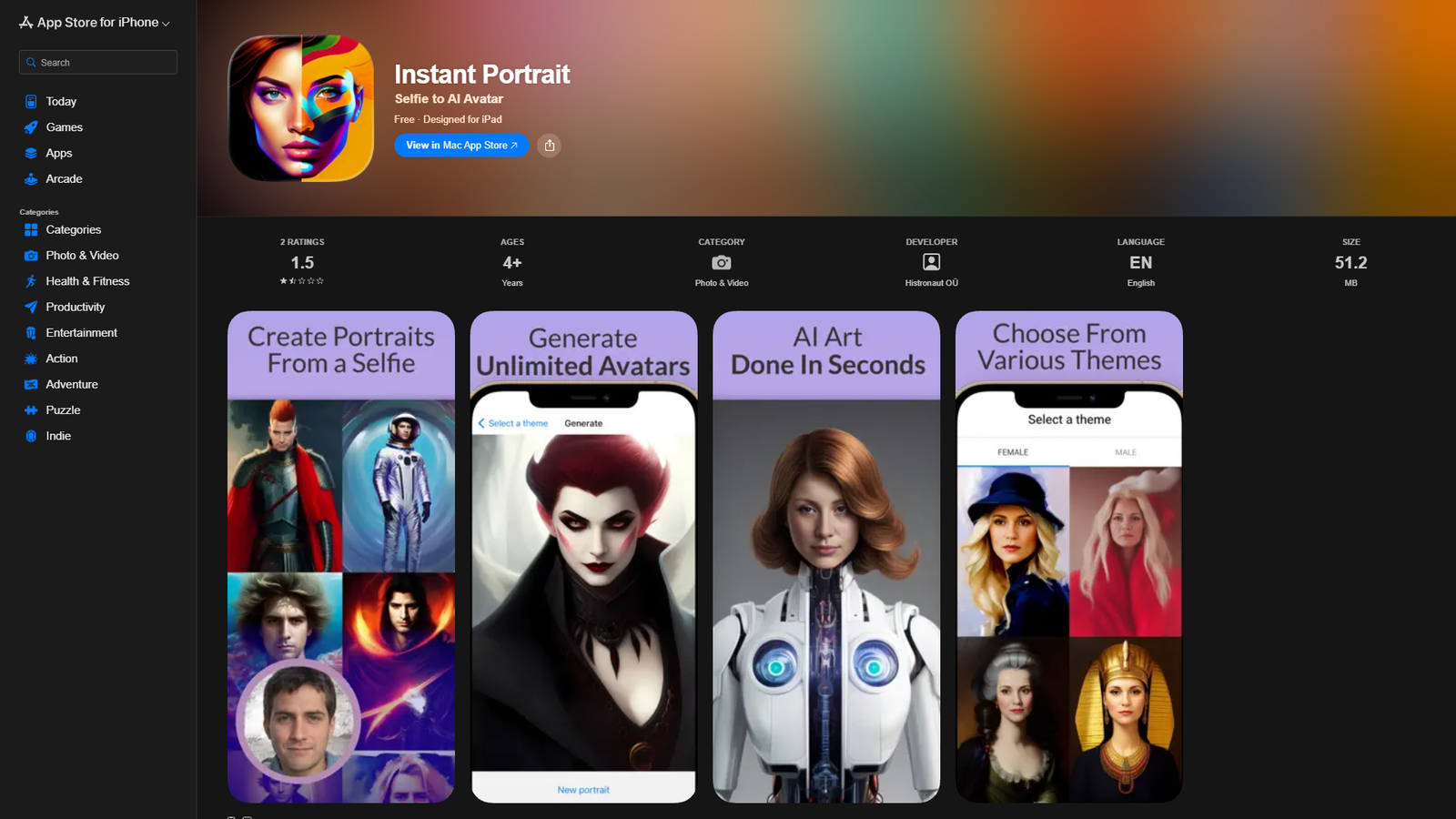 Приложение доступно для iPhone и iPad через App Store, имеет небольшой размер и ориентировано на быстрый старт без сложной регистрации. Instant Portrait — это простой способ познакомиться с возможностями AI‑портретов в формате мобильного приложения.