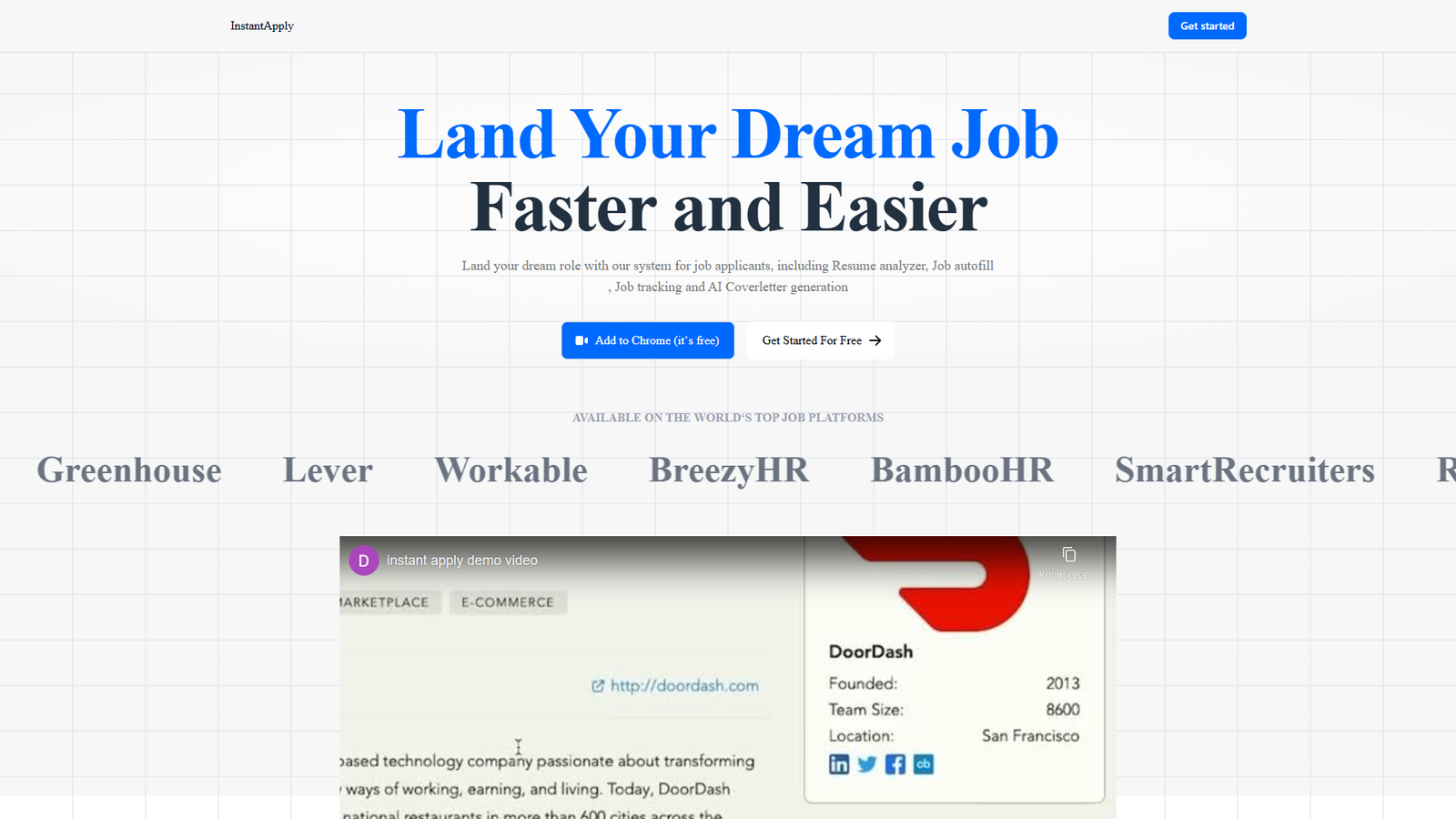 InstantApply — это AI-сервис для соискателей, который помогает быстрее проходить отклик на вакансии и повышать шансы на приглашение на интервью. Он анализирует ваше резюме, подсказывает недостающие ключевые слова и автоматически заполняет формы отклика на популярных job-платформах.