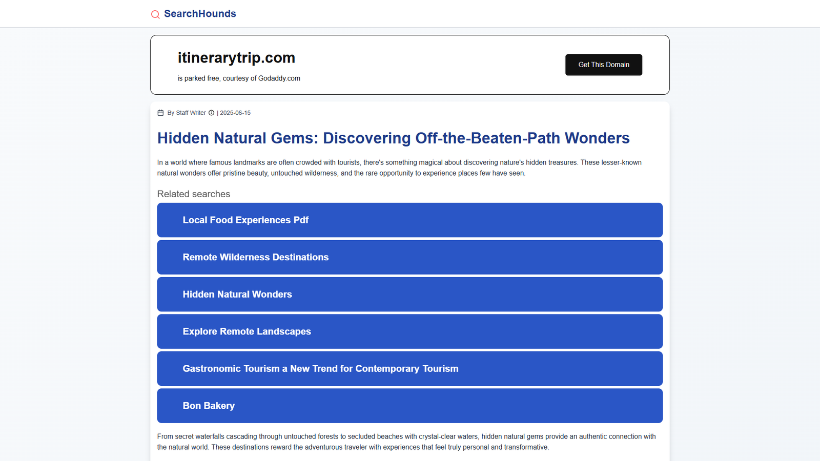 SearchHounds сейчас открыт как припаркованный домен itinerarytrip.com у регистратора GoDaddy. На странице размещён типовой контент о путешествиях и скрытых природных локациях, но функционала для пользователя пока нет.