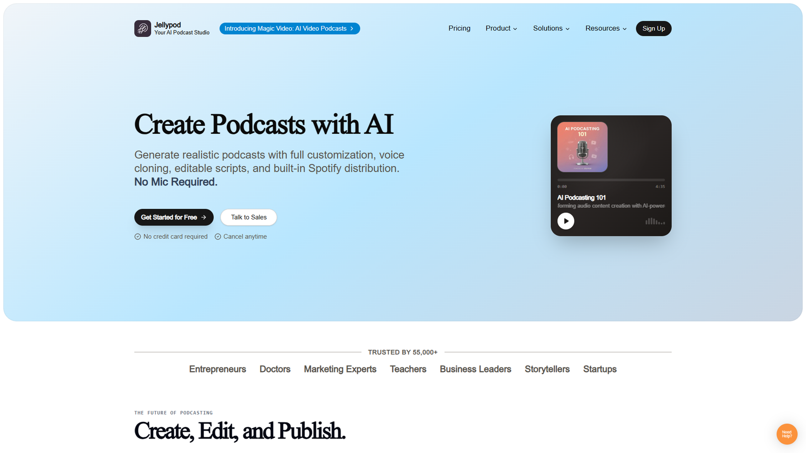 Jellypod — это AI-студия подкастов, которая позволяет создавать профессиональные аудиошоу без микрофона и сложного монтажа. Сервис автоматизирует весь цикл: от сценария и голосов до публикации на популярных подкаст-платформах.