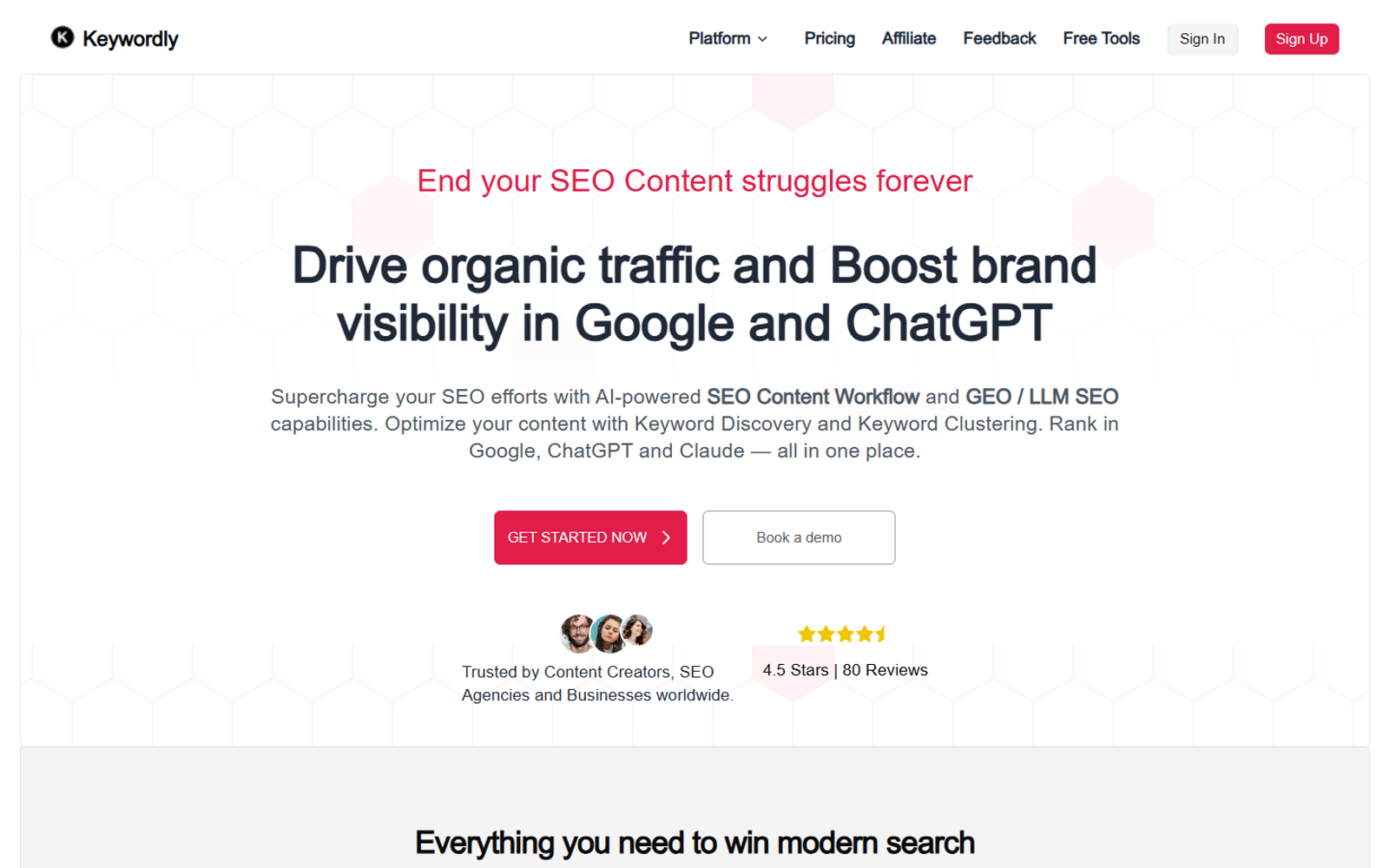 Сервис сочетает классические SEO-подходы с возможностями ИИ и LLM (ChatGPT, Claude и др.), чтобы ваш контент находили не только в Google, но и в умных ассистентах. Keywordly помогает открывать новые ключевые запросы, автоматически кластеризовать их и выстраивать структуру контента под реальные поисковые намерения.