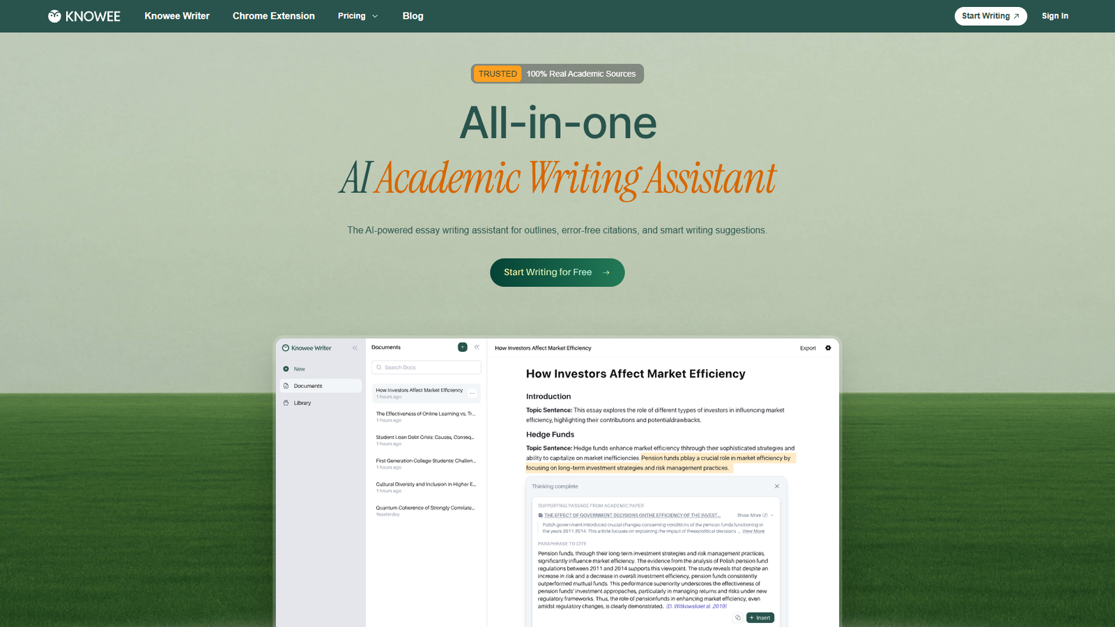 Knowee Writer — это ИИ-ассистент для академического письма, созданный специально для студентов, исследователей и преподавателей. Сервис помогает быстро готовить эссе, курсовые и научные статьи, сохраняя академическую честность и опираясь на реальные источники.