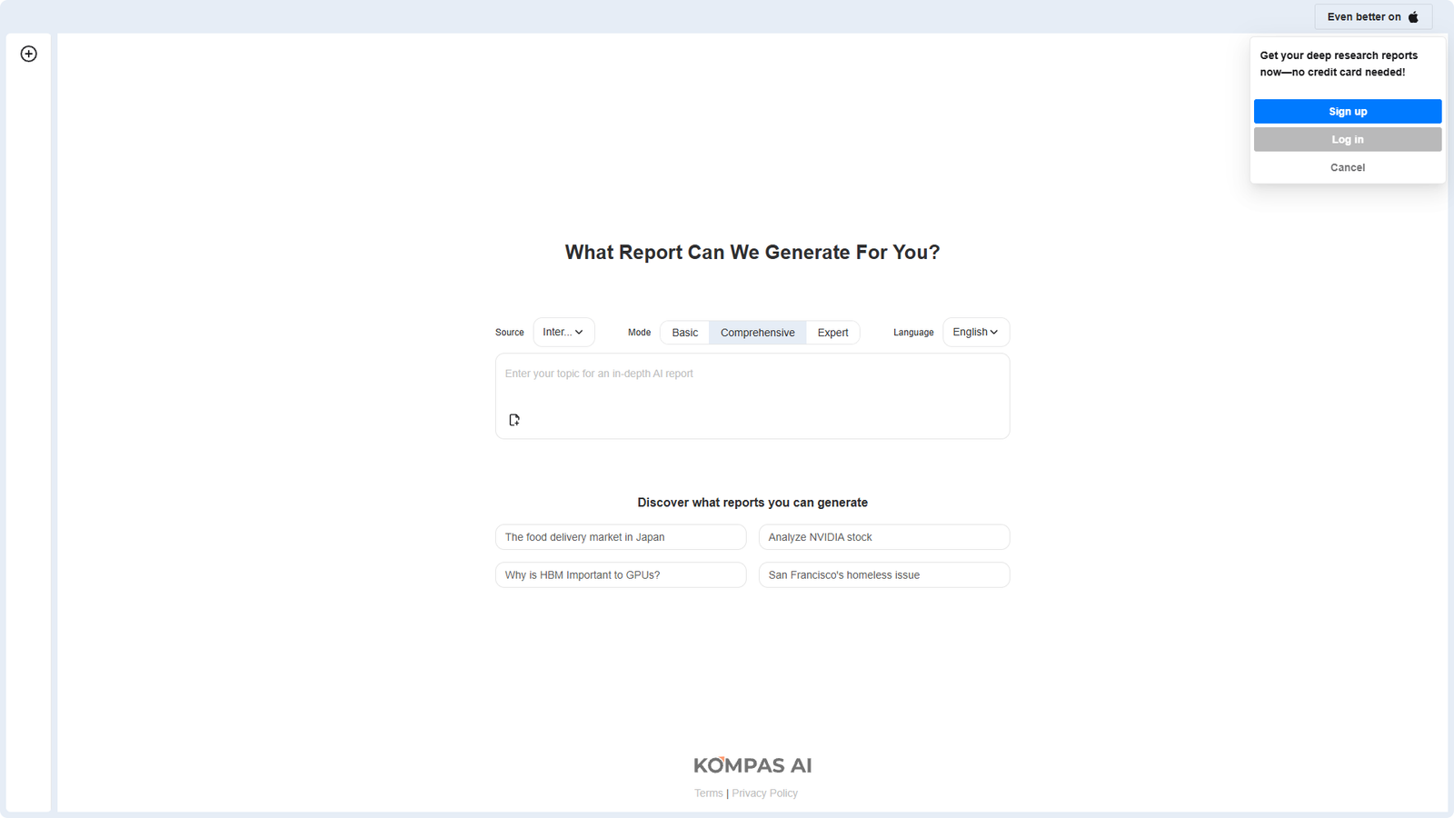Пользователь задает тему — от рынка доставки еды в Японии до анализа акций NVIDIA или значения HBM для видеокарт. Kompas AI проходит по источникам, выделяет ключевые факты, тренды и взаимосвязи, а затем структурирует выводы в удобный формат.