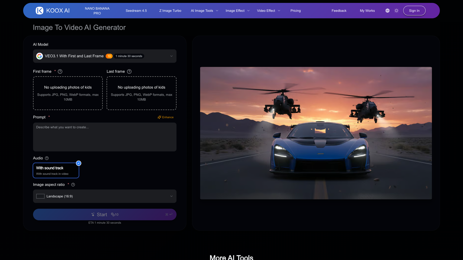 Инструмент поддерживает загрузку первого и последнего кадра. Это помогает точнее контролировать композицию: задать стартовую сцену и финальный ракурс, а нейросеть плавно «прорисует» движение между ними. Поддерживаются форматы JPG, PNG и WebP размером до 10 МБ.