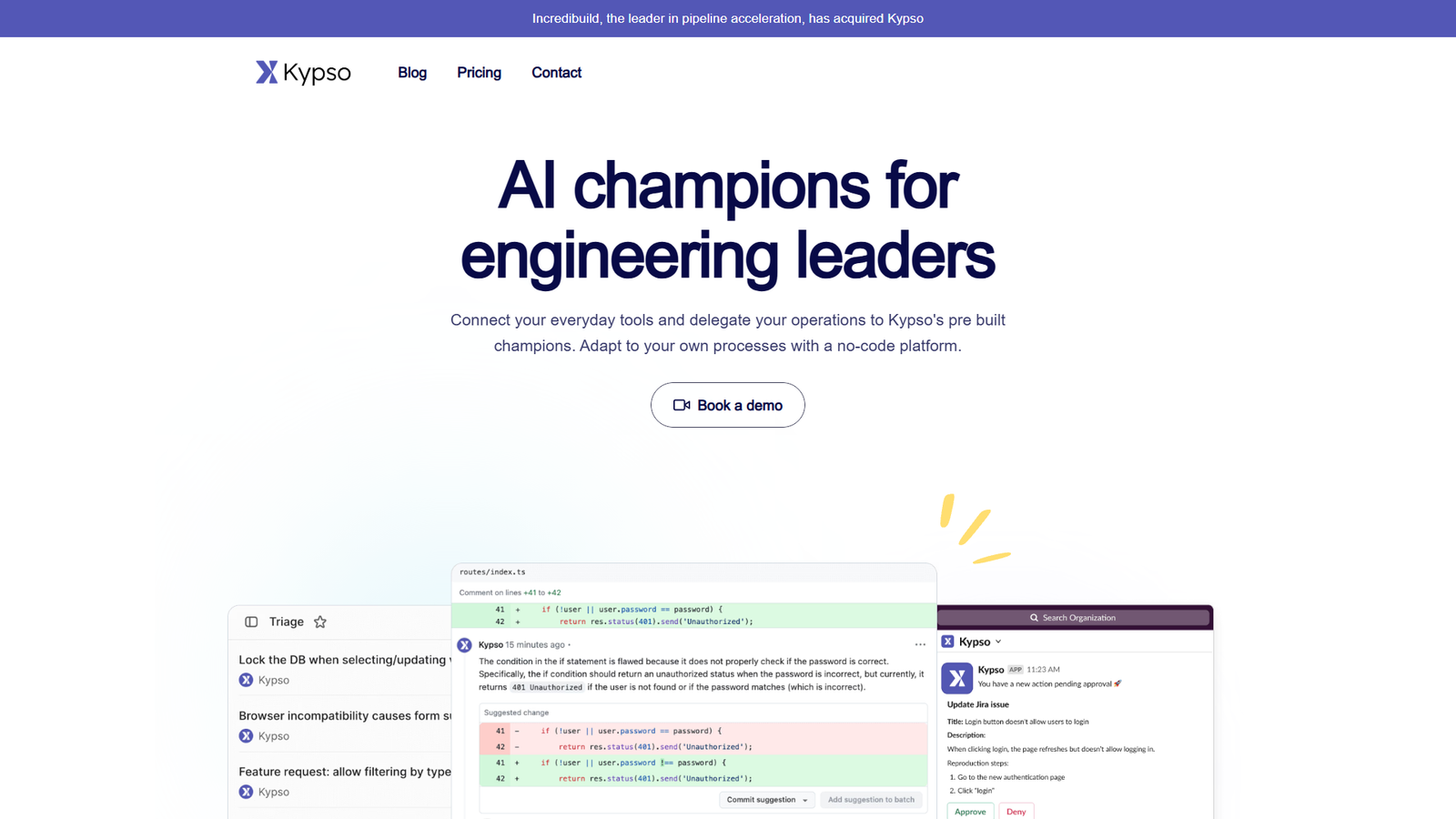 Kypso — это платформа для инженерных руководителей, которая превращает рутинные процессы разработки в управляемые ИИ‑«чемпионами». Сервис помогает делегировать операционные задачи умным агентам, интегрированным с вашими повседневными инструментами.