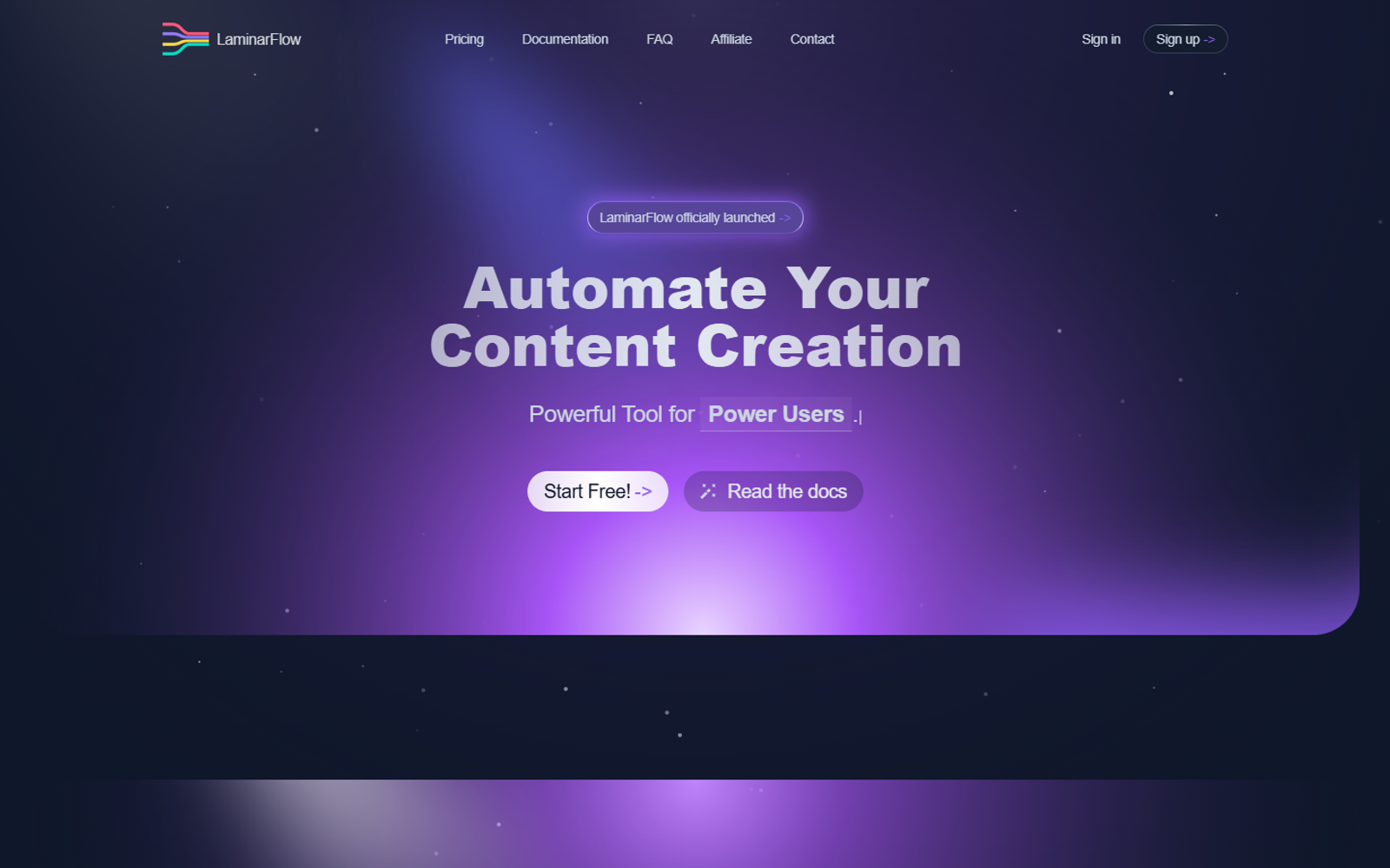 LaminarFlow автоматизирует создание и публикацию контента для блогеров, разработчиков и владельцев сайтов. Инструмент выстраивает цепочки действий, которые берут данные из внешних источников, обрабатывают их с помощью ИИ и превращают в готовые материалы.