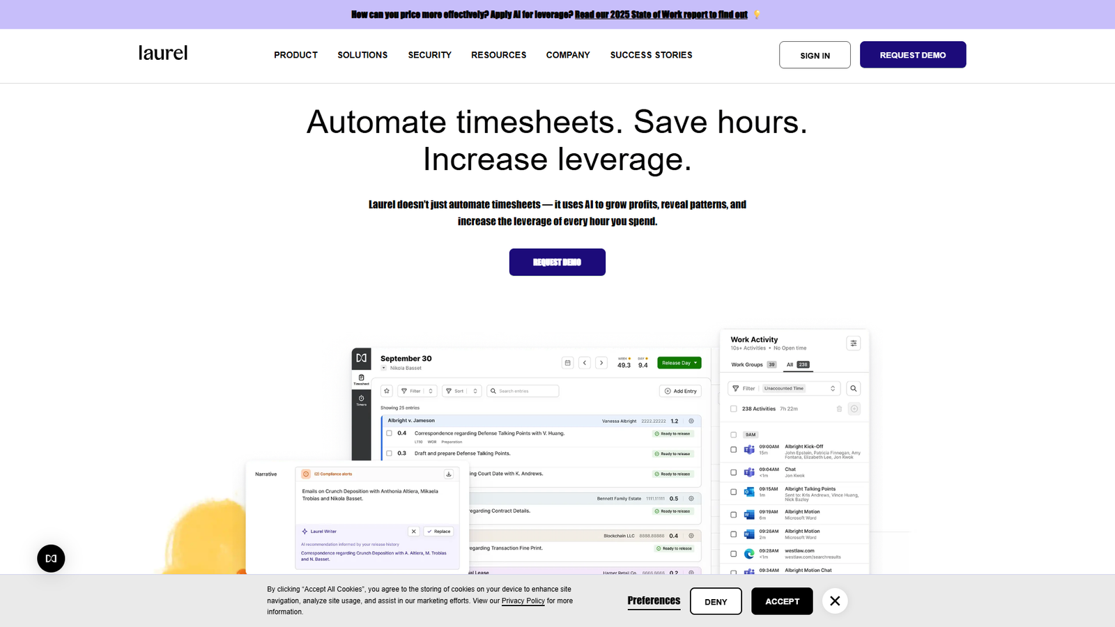 Laurel — это AI-платформа для автоматизации таймшитов в юридических и бухгалтерских фирмах уровня enterprise. Сервис избавляет специалистов от ручного учета рабочего времени, сокращает потери выручки и помогает руководству видеть, где именно скрыты резервы эффективности.
