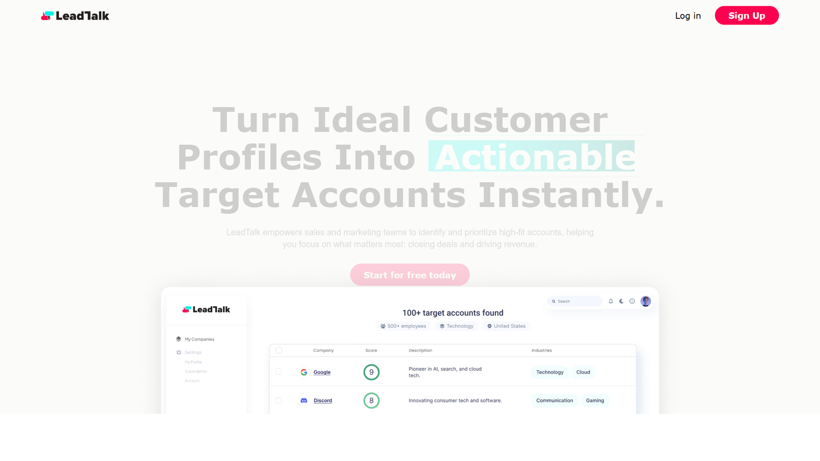 LeadTalk помогает командам продаж и маркетинга превращать абстрактные портреты идеального клиента в конкретные целевые аккаунты. Вместо ручного поиска и фильтрации данных пользователь задаёт критерии ICP и сразу получает список компаний с высоким соответствием.