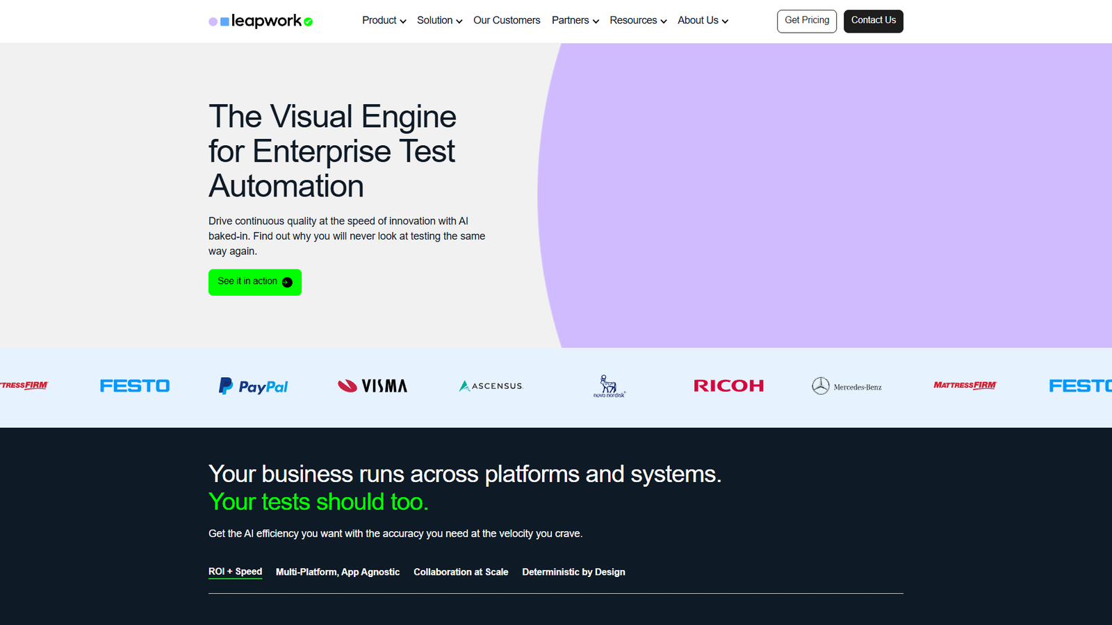 Платформа поддерживает тестирование веб-приложений, десктопных систем и сложных корпоративных ландшафтов, включая кроссплатформенные сценарии. Leapwork помогает масштабировать автоматизацию по всей организации, ускорять релизы и повышать ROI за счёт сокращения ручного тестирования и времени регрессии.
