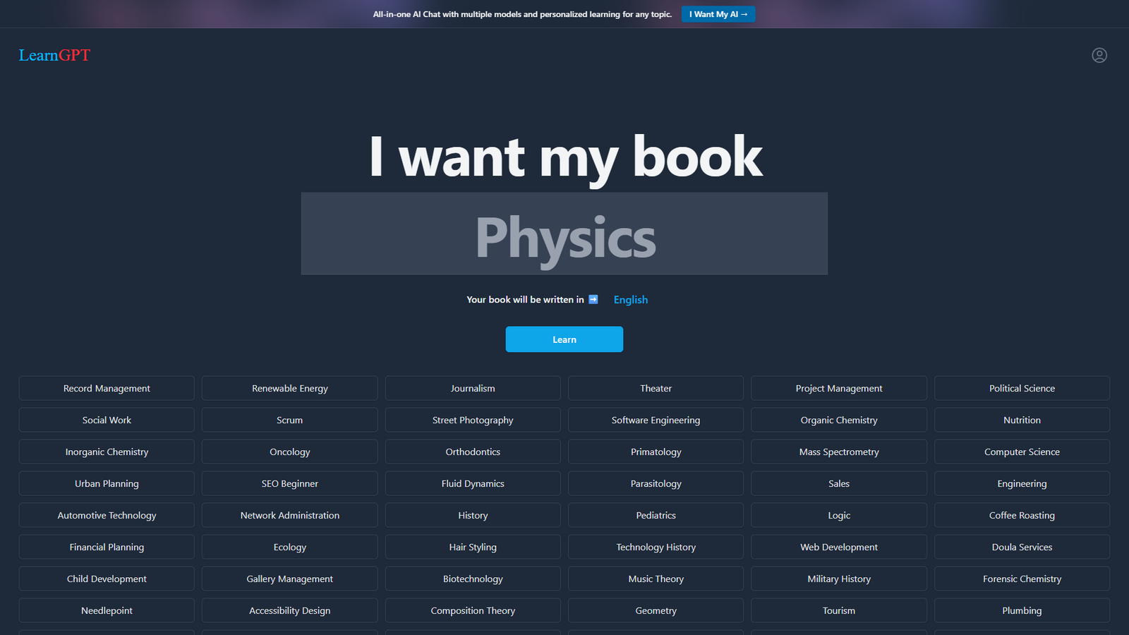 LearnGPT — это единый AI-чат с несколькими моделями, который превращает любой сложный предмет в персонализированный курс обучения. Сервис помогает «заказать» себе собственную книгу или учебник по нужной теме и получить объяснения в удобном формате диалога.