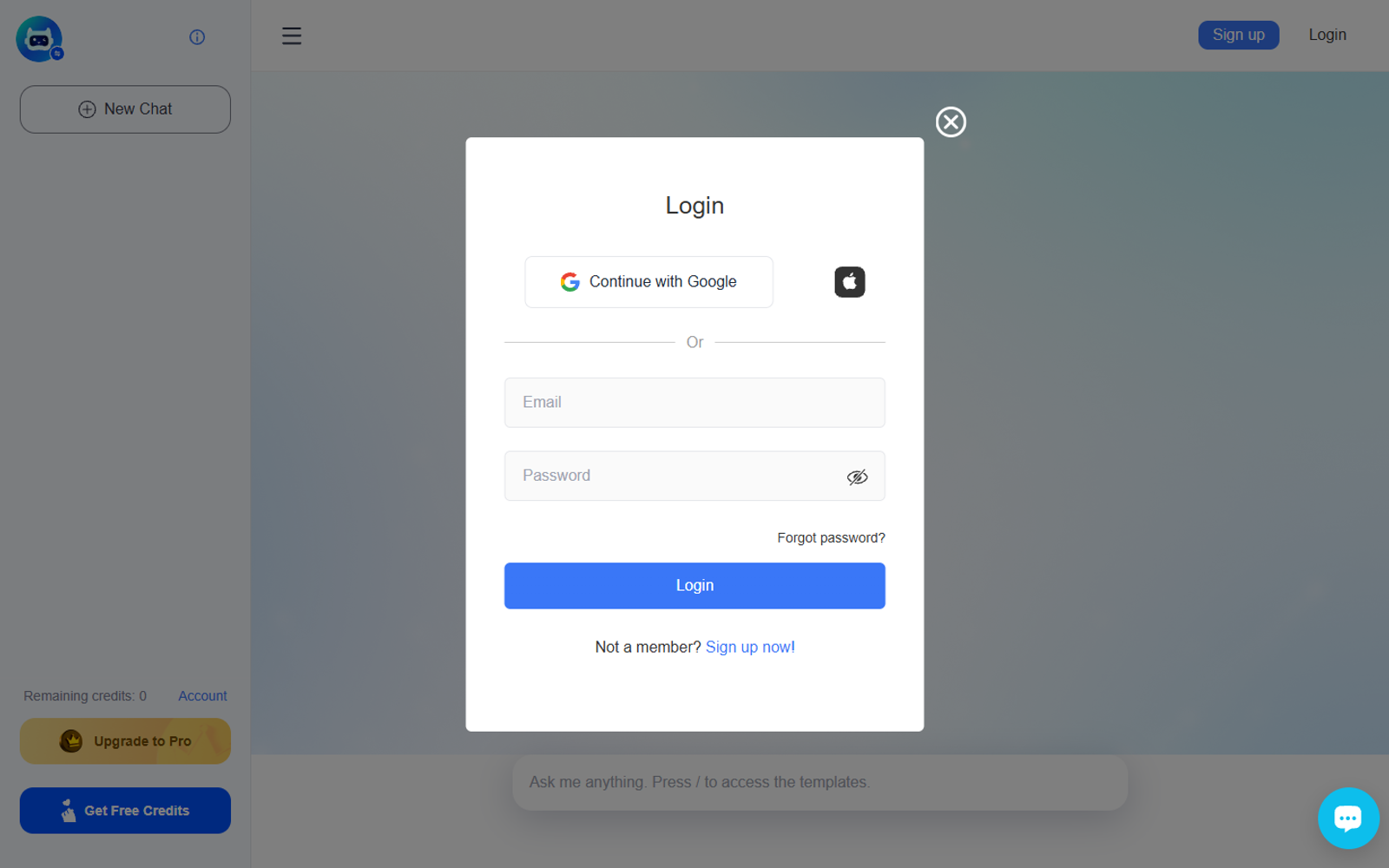 Для использования сервиса требуется регистрация или вход в аккаунт. Доступен вход через Google, а также базовый бесплатный тариф с кредитами и возможность перейти на Pro-аккаунт или получить дополнительные бесплатные кредиты.