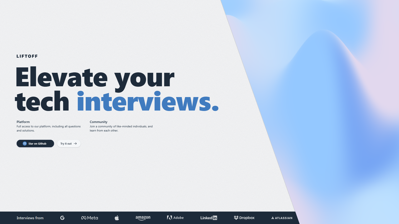 Liftoff — это платформа для проведения тренировочных технических собеседований с поддержкой ИИ. Сервис помогает кандидатам подготовиться к интервью в IT‑компаниях, отработать навыки решения задач и уверенно чувствовать себя на реальном собеседовании.