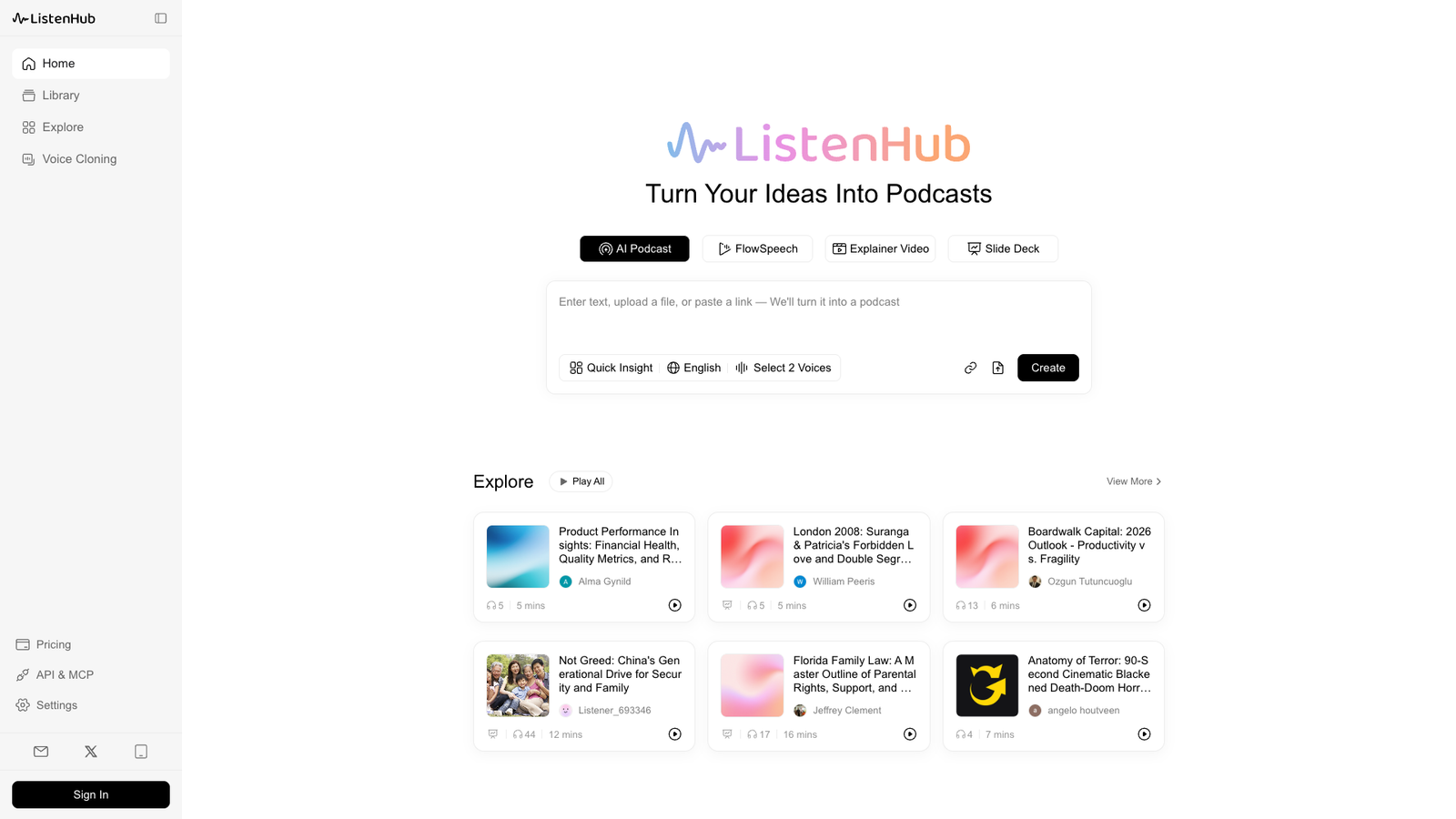 ListenHub превращает любые идеи и материалы в готовые подкасты с естественным звучанием. Пользователь загружает файлы, вставляет ссылку на YouTube или вводит тему, а система строит диалог и озвучивает его реалистичными голосами.