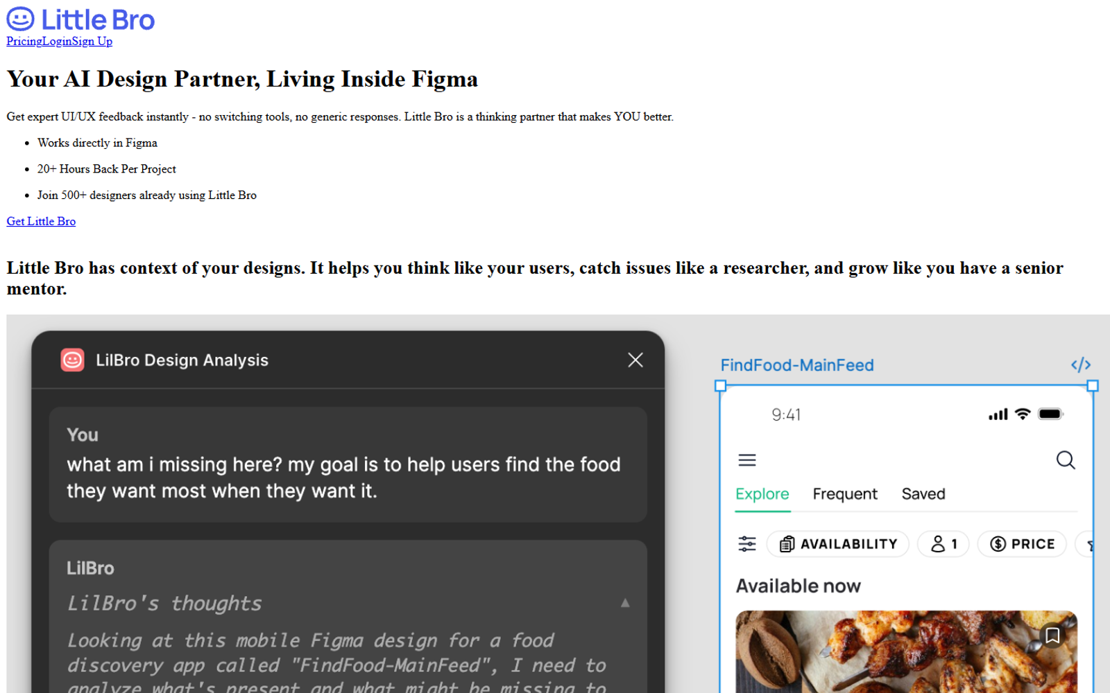 Little Bro — это ИИ-партнёр по дизайну, который живёт прямо внутри Figma и помогает принимать более сильные продуктовые и UX-решения без переключения между инструментами.