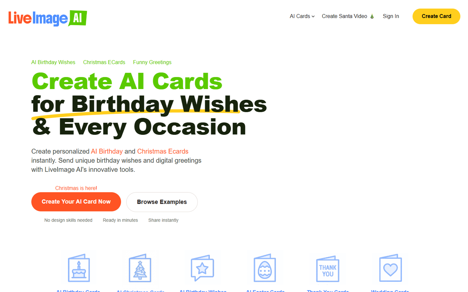 LiveImage AI Cards — это онлайн-сервис для создания ярких AI-открыток и eCards для любых праздников и событий. День рождения, Рождество, Пасха, свадьба или просто тёплое «спасибо» — платформа помогает за минуты подготовить уникальное цифровое поздравление без навыков дизайна.