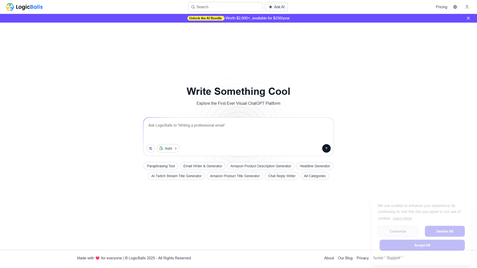 LogicBalls — это онлайн-платформа на базе ИИ для быстрого создания текстового контента: от писем и описаний товаров до заголовков и ответов в чате. Сервис позиционируется как «визуальный ChatGPT», предлагая удобный интерфейс и готовые шаблоны под разные задачи.