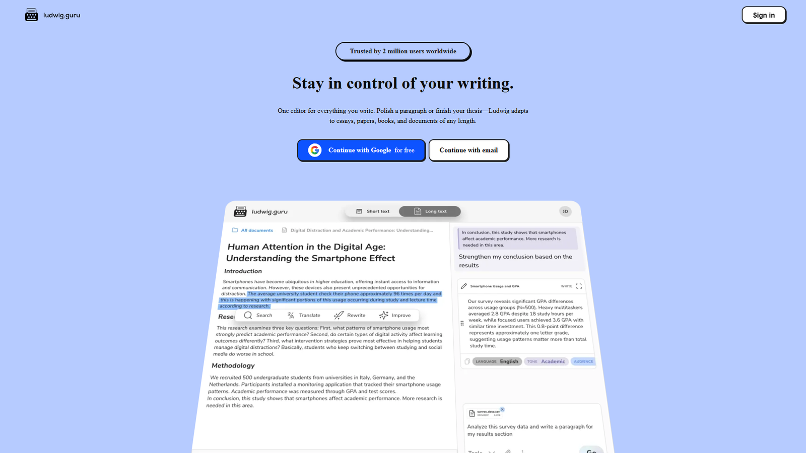 Ludwig — онлайн‑платформа для улучшения английского письма, которая помогает подбирать точные формулировки на основе реальных примеров из надежных источников. Сервис ориентирован на тех, кто хочет писать по‑английски естественно, грамотно и в нужном стиле — от коротких абзацев до объемных академических работ.