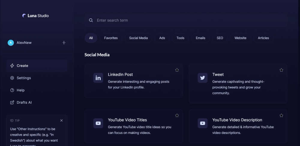 Нейросеть Luna ai понимает 120 языков мира, включая русский. Модель ИИ обучена анализировать концепцию и тематику личной страницы или блога в социальной сети LinkedIn. Нейросеть способна по запросу предлагать идеи для новых публикаций. ИИ может сгенерировать текст и иллюстрацию в необходимой стилистике. На текущий момент интеграция с социальной сетью не предусмотрена.