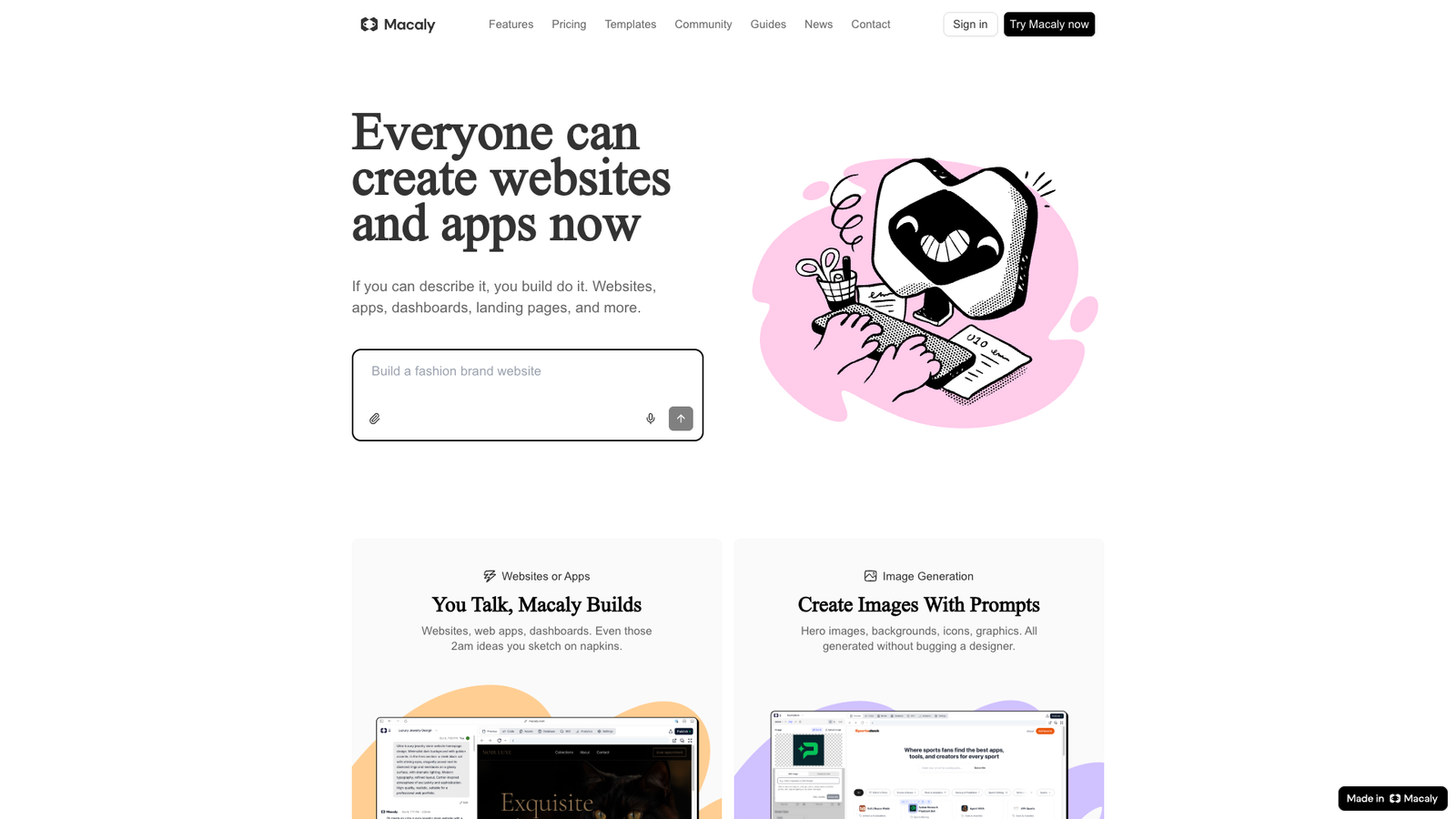 Macaly — это конструктор сайтов и веб‑приложений на базе ИИ для основателей и малого бизнеса. Из короткого текстового описания здесь собираются полноценные лендинги, дашборды и веб‑приложения, готовые к публикации.
