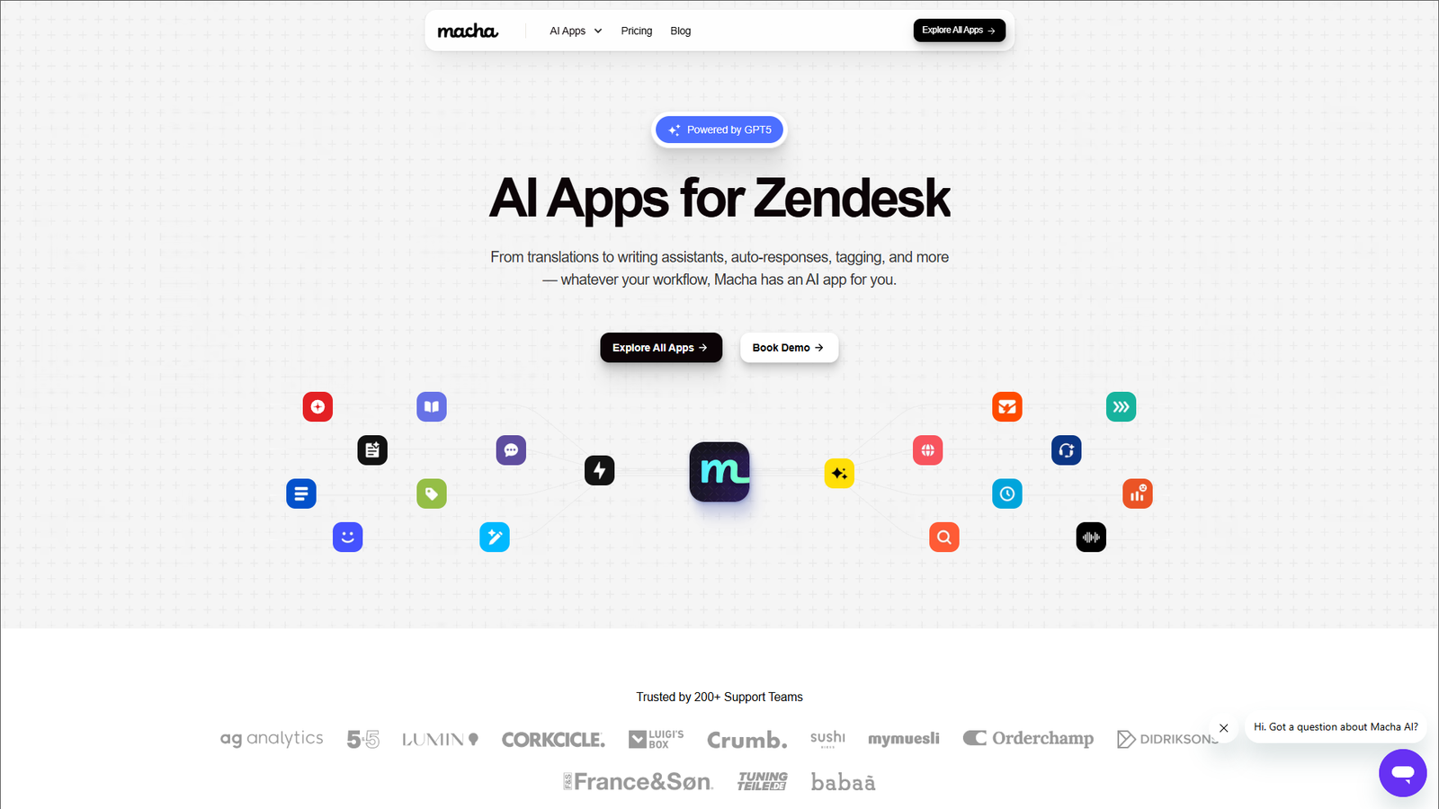 Macha AI — это набор AI-приложений для Zendesk, созданных для ускорения и автоматизации работы службы поддержки. Сервис помогает командам поддержки отвечать быстрее, точнее и на разных языках, не меняя привычный интерфейс Zendesk.