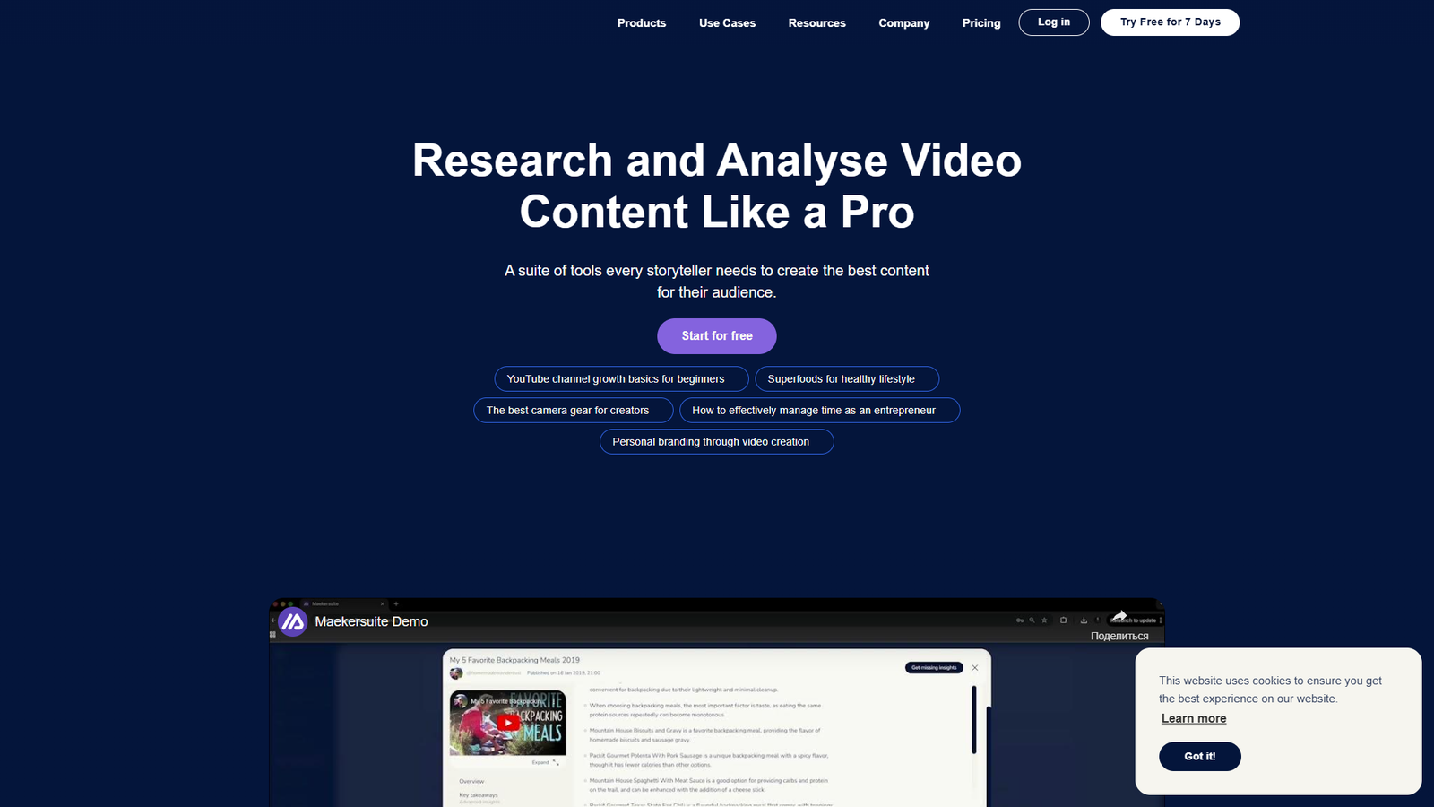 Maekersuite — это платформа для продакшн-подготовки видео, которая помогает ютуберам, агентствам и бизнесу создавать контент на основе данных, а не догадок. Сервис анализирует существующие ролики и ниши, чтобы вы могли понимать, какие темы, форматы и сценарные подходы действительно работают для вашей аудитории.