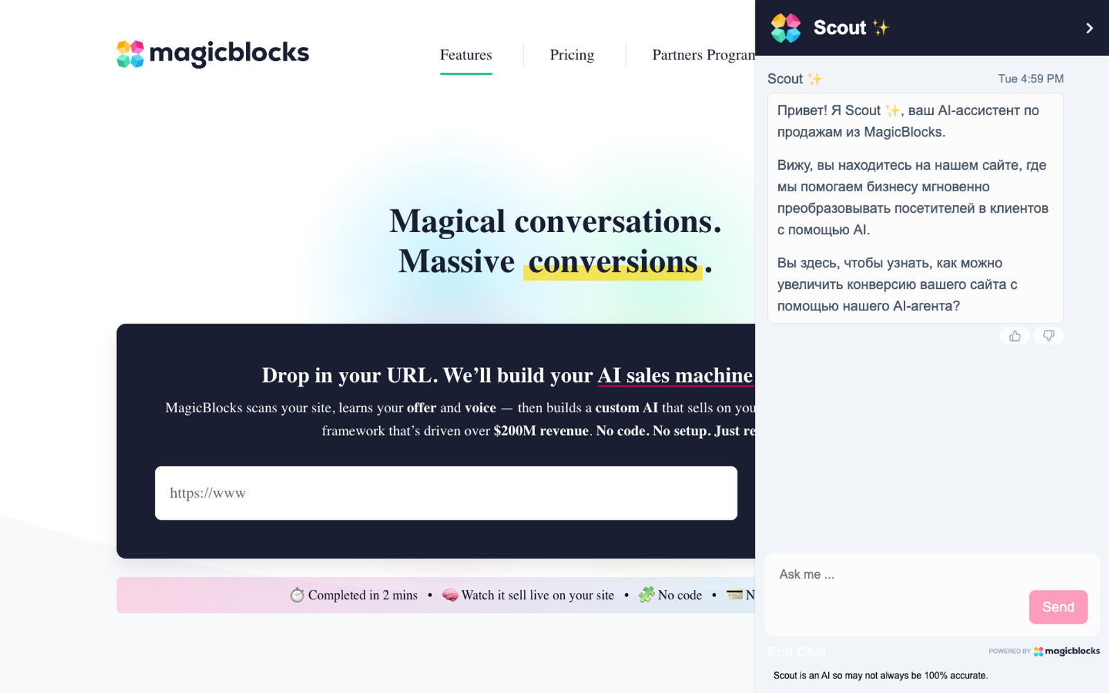 MagicBlocks создает на сайте «продажников» на базе ИИ, которые ведут диалоги с посетителями и превращают их в клиентов. Достаточно указать URL: система сканирует страницы, разбирается в оффере, тоне бренда и за пару минут собирает готового агента продаж.