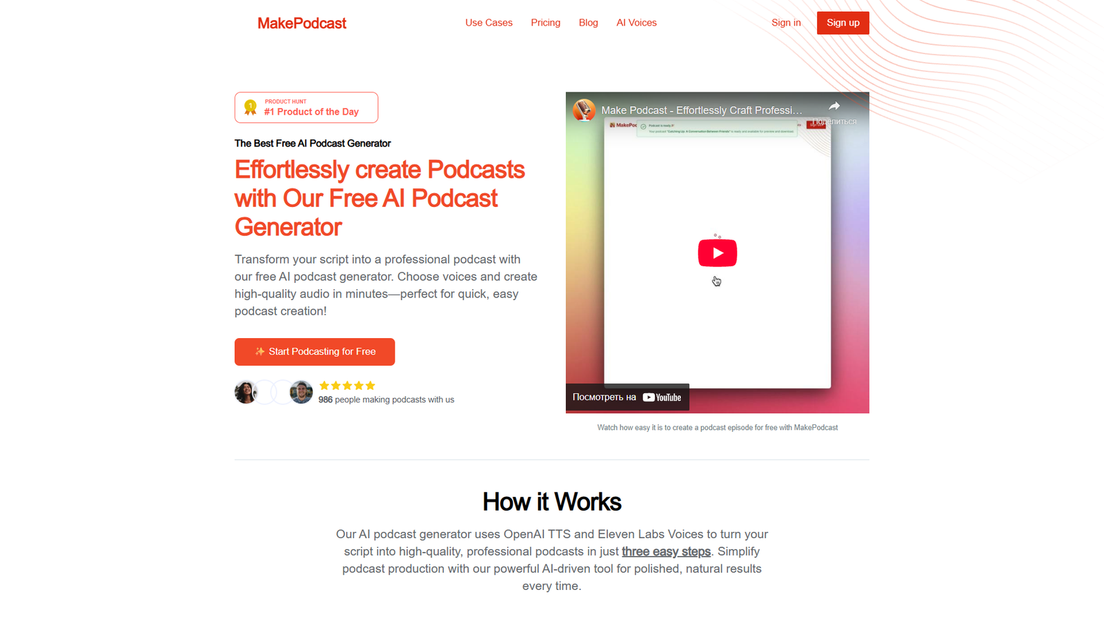 MakePodcast — это бесплатный AI‑генератор подкастов, который превращает готовый сценарий в профессиональное аудио всего за несколько минут. Сервис идеально подходит для тех, кто хочет быстро запустить подкаст без сложного монтажа, студийной записи и дорогого оборудования.