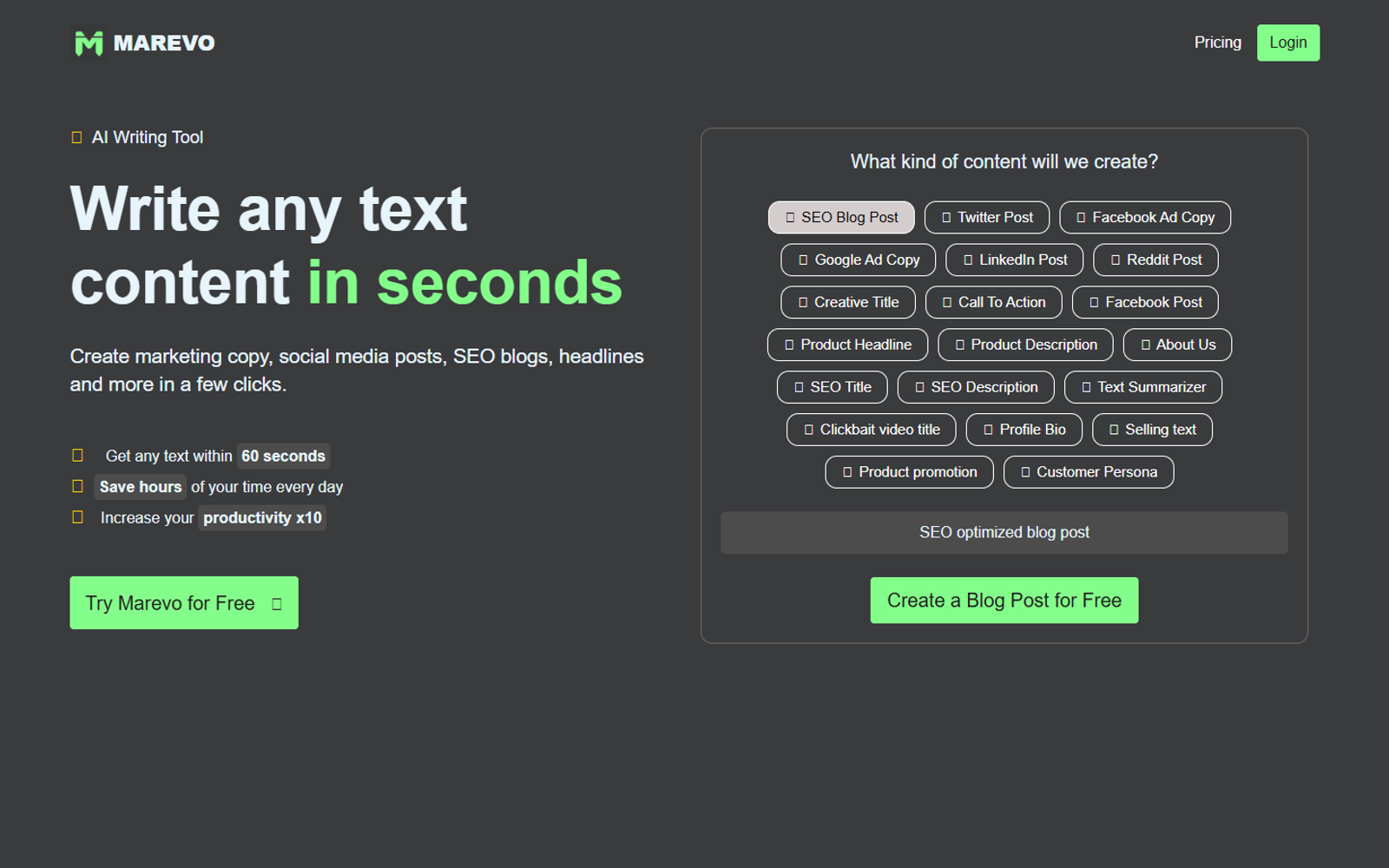Marevo — инструмент для быстрой генерации текстов на основе ИИ. Он помогает за минуты получать готовый контент для маркетинга, блогов и соцсетей, вместо долгой ручной работы.