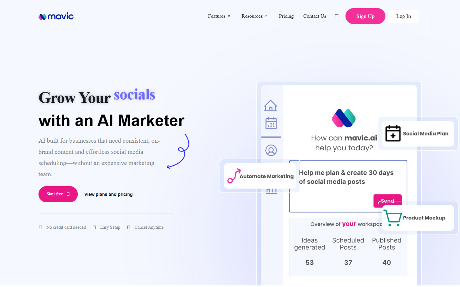 Mavic — это ИИ-маркетолог, который помогает бизнесу вести соцсети без штатной команды. Инструмент фокусируется на стабильном, «онбрендовом» контенте и автоматическом расписании публикаций.