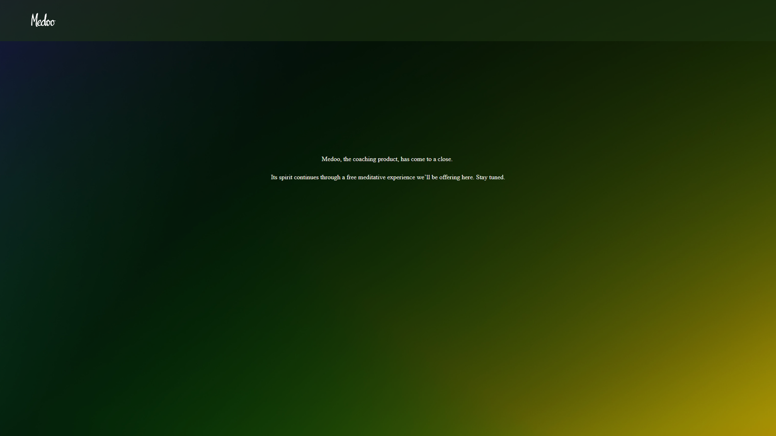 На сайте указано, что Medoo как coaching software «has come to a close». Вместо него планируется продолжение идеи в другом формате — бесплатном медитативном опыте, который будет доступен здесь же. Пользователям предлагают следить за обновлениями.