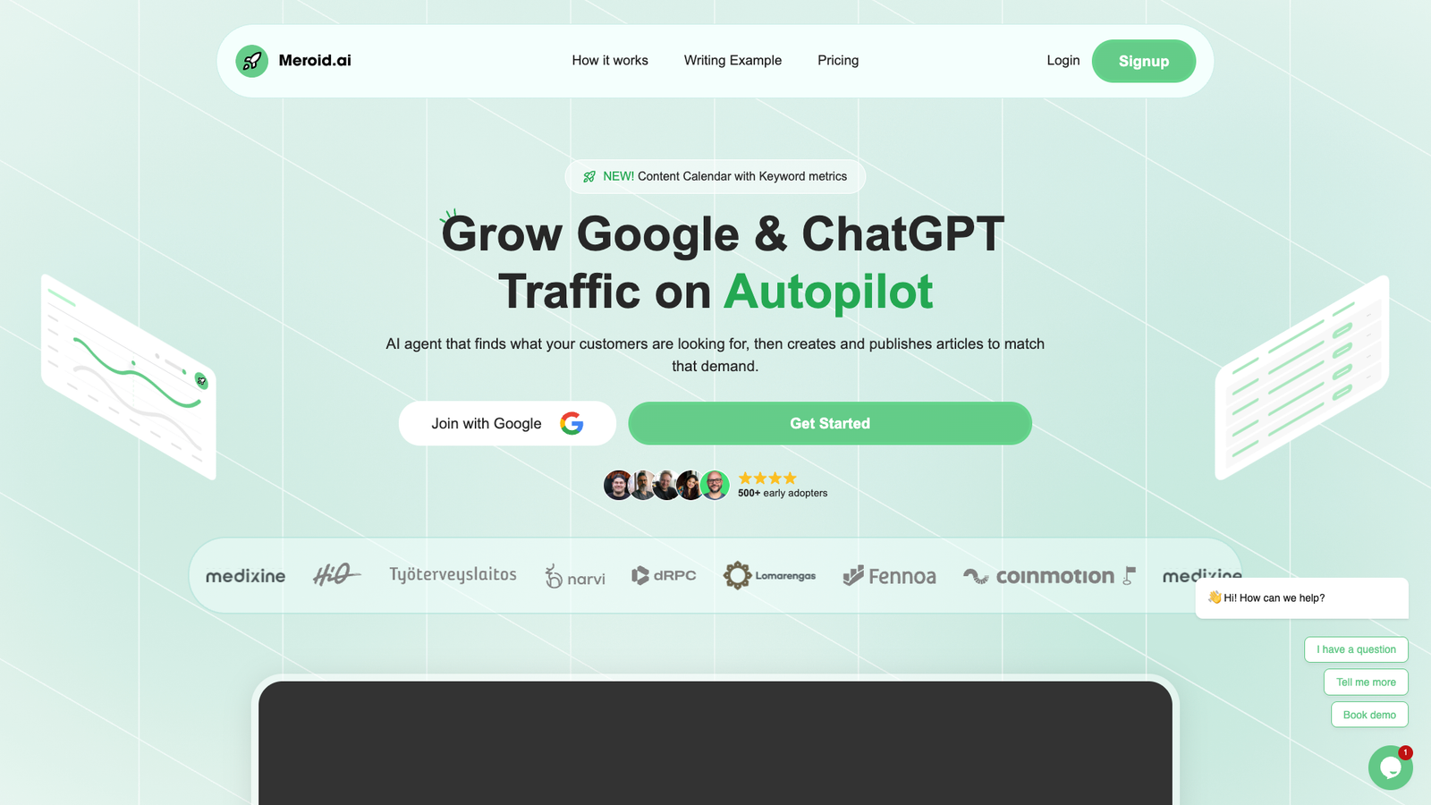Meroid — это SEO-агент на базе ИИ, который берёт на себя полный цикл работы с контентом: от поиска спроса до публикации статей. Инструмент ориентирован на рост органического трафика из Google и ответов в ChatGPT без ручной рутины.