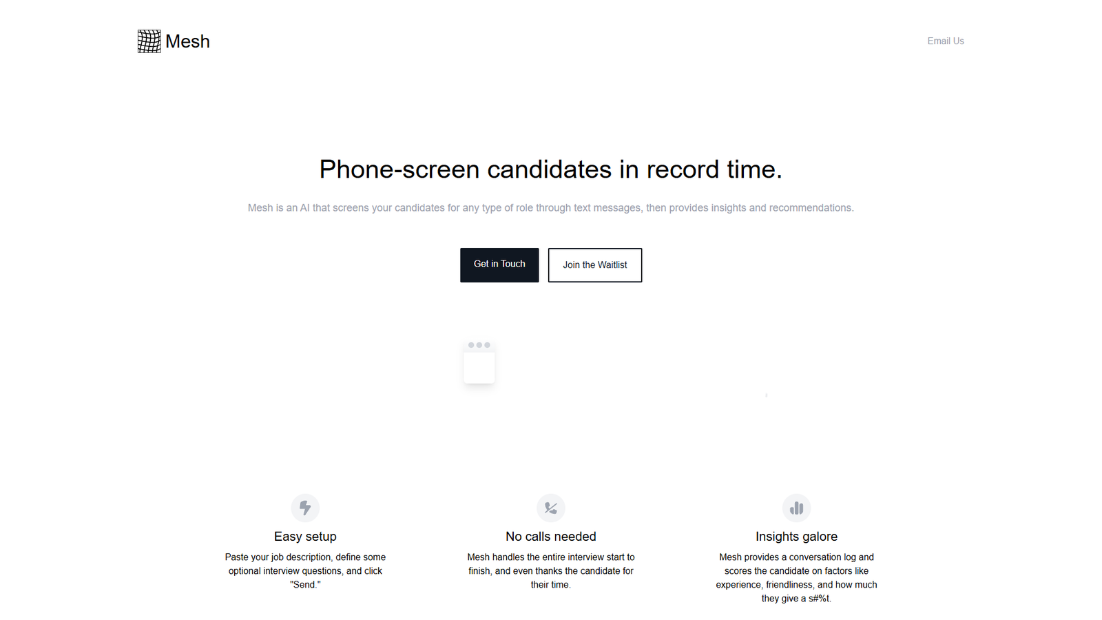 Mesh — это AI-сервис для мгновенного phone-screening кандидатов без звонков и долгих созвонов. Платформа проводит первичное интервью с соискателями через текстовые сообщения, а затем выдает рекрутеру структурированные инсайты и рекомендации.