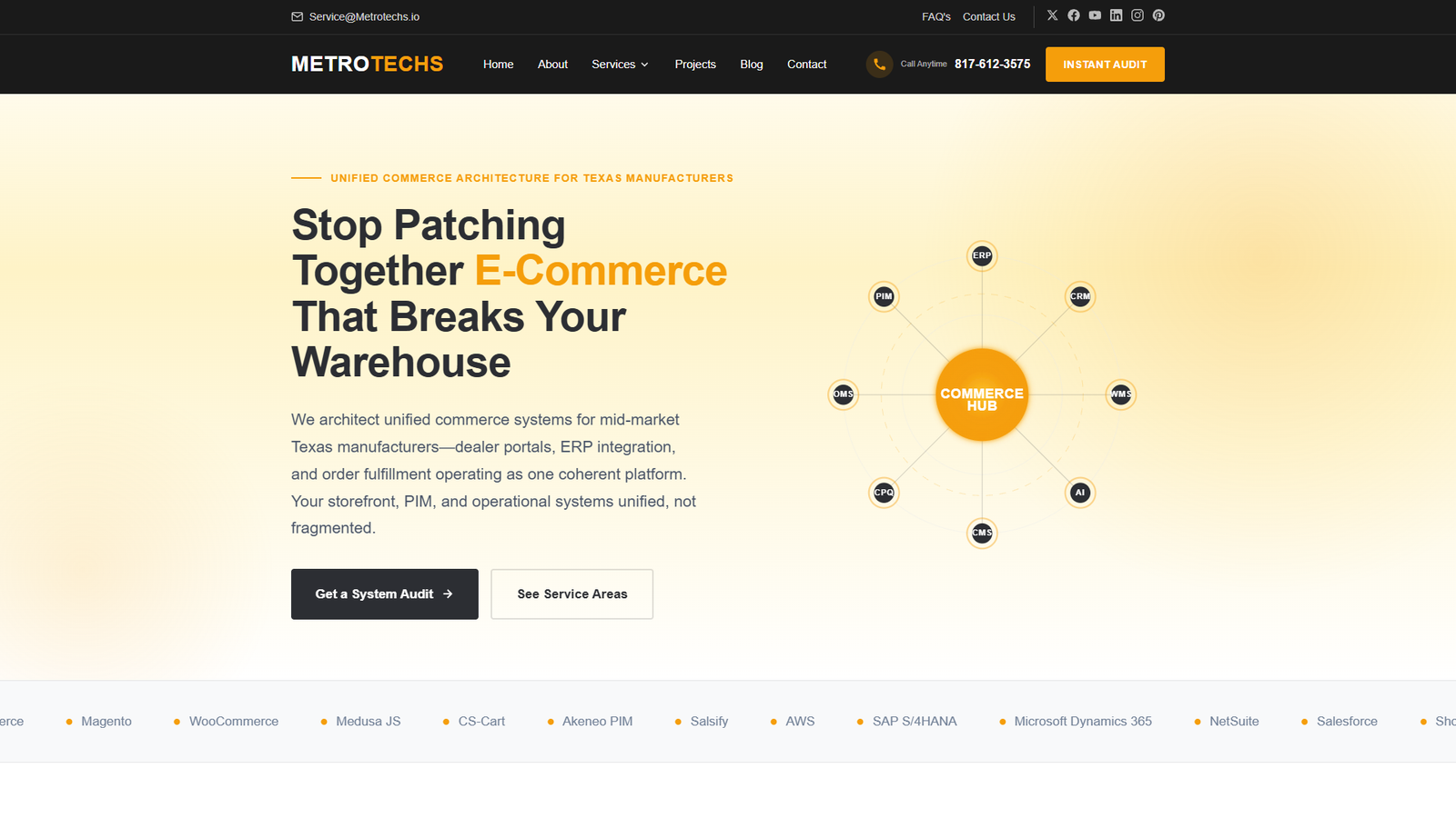Metrotechs выступает как middleware и интеграционный слой между ключевыми системами предприятия (ERP/CRM/WMS/OMS/CPQ/PIM) и e‑commerce. Поддерживаются популярные платформы и стеки: Shopify Plus, BigCommerce, Adobe Commerce/Magento, WooCommerce, Medusa, Akeneo PIM, Salsify, AWS, SAP S/4HANA, Microsoft Dynamics 365, NetSuite, Salesforce.