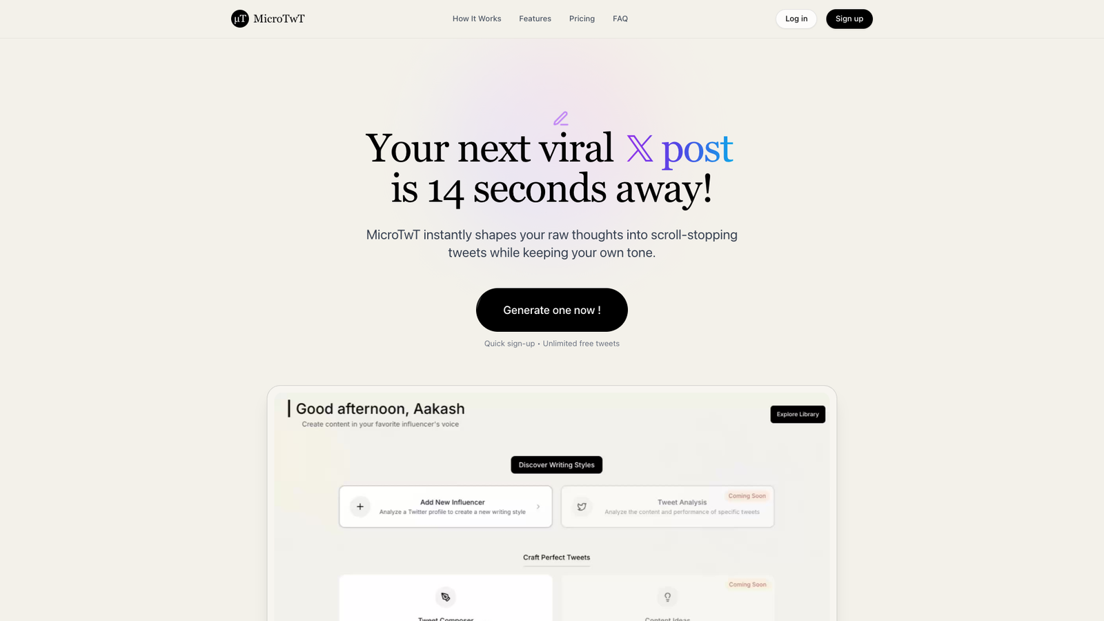 MicroTWT помогает превращать сырые заметки и черновики в готовые посты для X (бывший Twitter), ориентированные на вовлечение. Пользователь вводит короткую мысль, тезисы или неоформленный текст, а нейросеть за секунды доводит его до формата «скролл-стопящего» твита.