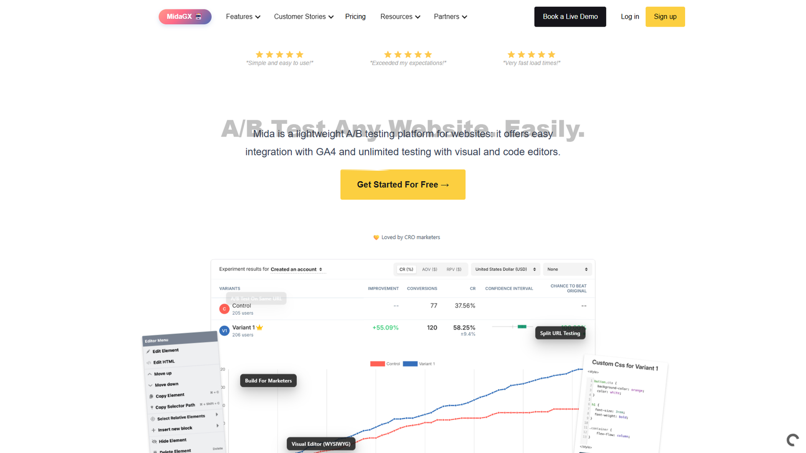 Сервис позволяет за минуты превратить гипотезу в живой эксперимент на том же URL или через split URL-тестирование. Поддерживаются визуальный WYSIWYG-редактор и работа через код, поэтому маркетологи и продакт-менеджеры могут менять контент, блоки и элементы интерфейса самостоятельно.