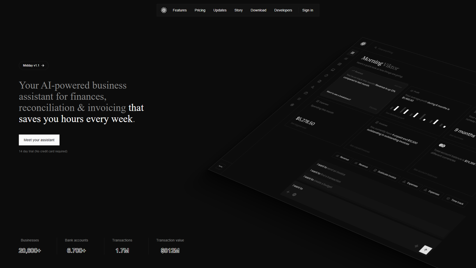Midday — это ИИ-ассистент для управления финансами бизнеса, сверки операций и выставления счетов. Инструмент берет на себя рутинные задачи, освобождая время владельцев и финансовых команд.