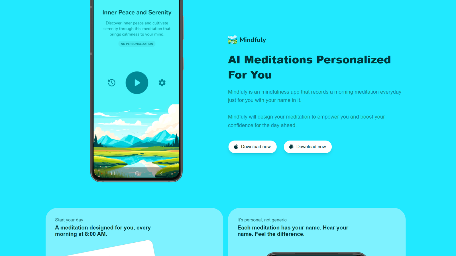 Mindfuly — это приложение для осознанности, которое использует ИИ, чтобы создавать персональные утренние медитации именно для вас. Каждый день вы получаете новую аудиозапись, в которой медитация обращается к вам по имени и подстраивается под ваши потребности.